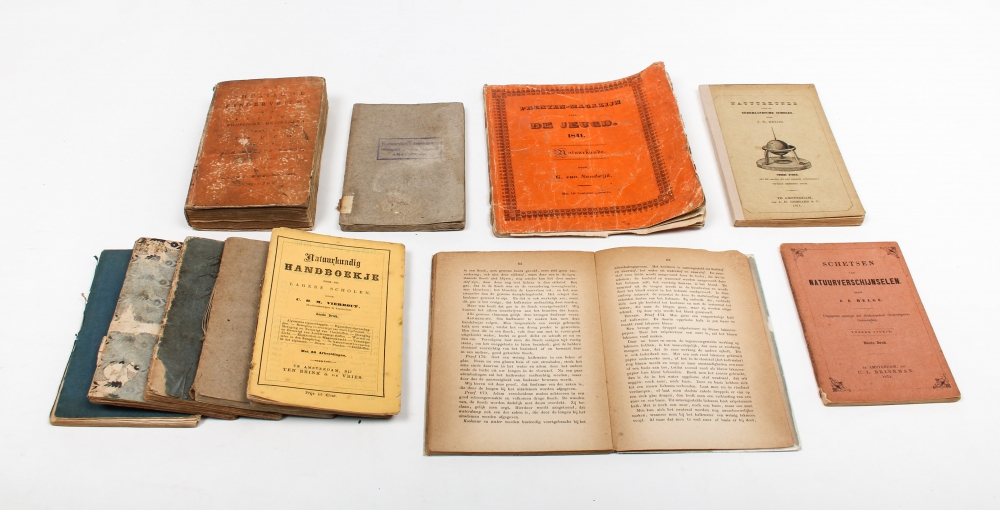 Very rare, two copies in PiCarta (with incorrect dating); (2) Prenten-Magazijn voor de jeugd. 1841. Natuurkunde. Door G. van Sandwijk. Met 16 houtsneê-gravures. Purmerend, D. Broedelet & Co., (1841), (34) p., with woodcuts, original printed wrapper, 4to (a few creases and stains/ folds on corners, title loose, wrapper slightly worn). Very rare, this copy with lovely handwritten school prize of Oudendijk, 1844; (3) Eerste beginselen der natuurkunde tot nut en vergenoeging van het dagelijksche leven, in leerlesjens voor de Bataafsche jeugd. Door J.A. Uilkens, Eerste stukjen. Amsterdam, J. van der Hey, 1804, IV,76 p., plain contemporary wrapper, small 8vo (small defects). And with another 7 (rare) similar works in 9 wrappers, printed in 1815, 1823-1827, 1860, 1874 (2x), 1876, 1878 (total 10).