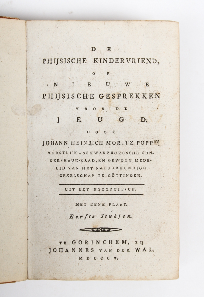 of Nieuwe phijsische gesprekken voor de jeugd. Door Hohann Heinrich Moritz Poppe. Uit het Hoogduitsch. Eerste stukjen. Gorinchem, J. van der Wal, 1805-1808, 2 parts in one volume, VIII,192; (4),193-314,(2) p., with 2 folding, engraved plates, original printed cardboard, small 8vo (small hole in first title, a few old owner's names, binding slightly worn).