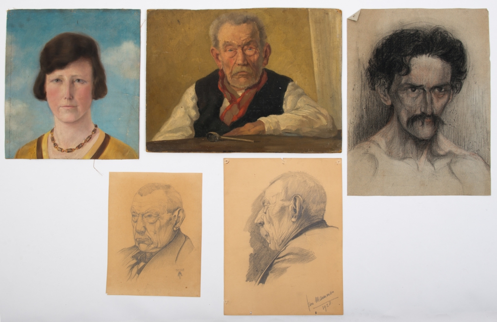 (2) Idem (attributed). Portrait of the same old man as depicted in the former, oil on panel, 30 x 40 cm.; (3) Idem (attributed). Portrait of a naked man with moustache. Drawing in black and red chalk, 38.5 x 29.5 cm.; (4 and 5) And another two portraits, of which one monogrammed by Jan Mammen (once again the old man) and a female portrait in oil on canvas (total 5).