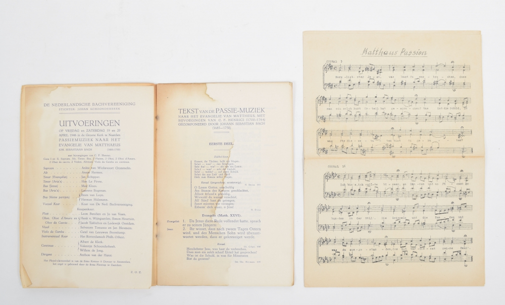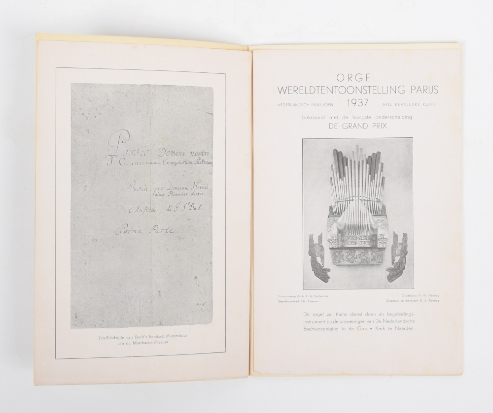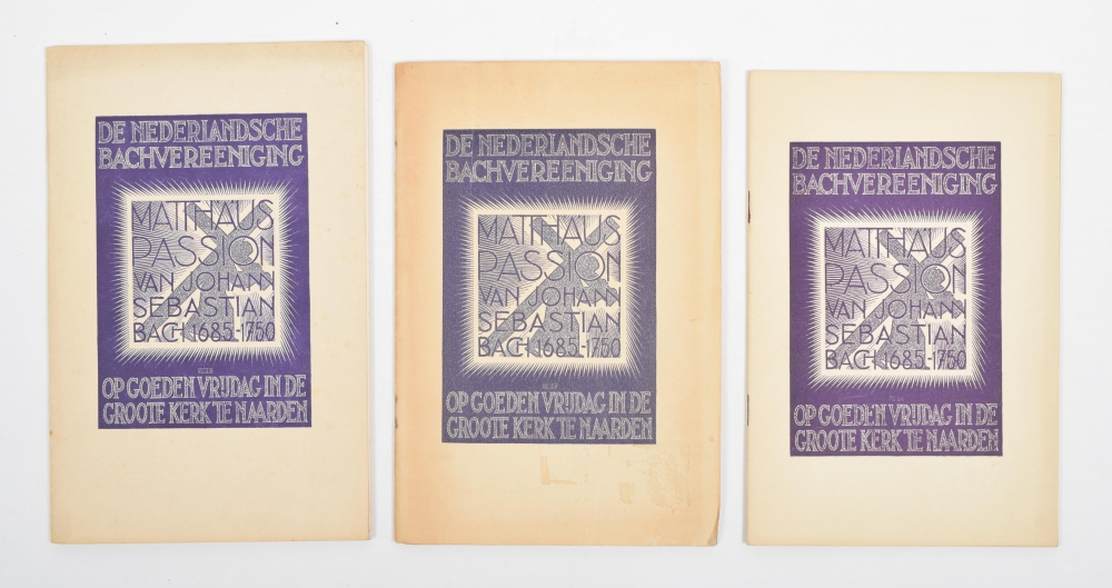 Matthäuspassion van Johan Sebastian Bach 1685-1750. Op goeden vrijdag in de Groote Kerk te Naarden. Amsterdam, printed by M.J. Portielje for D.N.B., no date (1938 or later), (23) p., original stapled wrapper printed in purple with woodcut monogrammed in block by Escher.