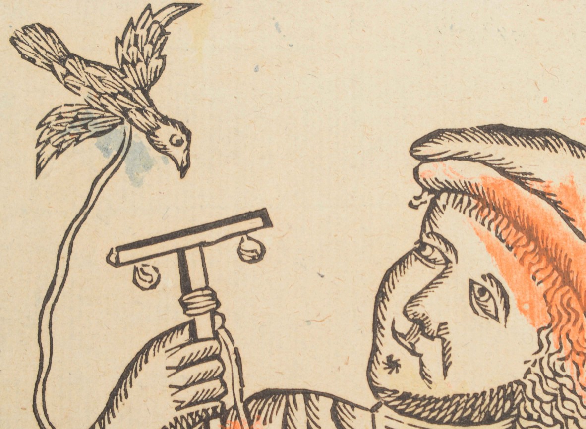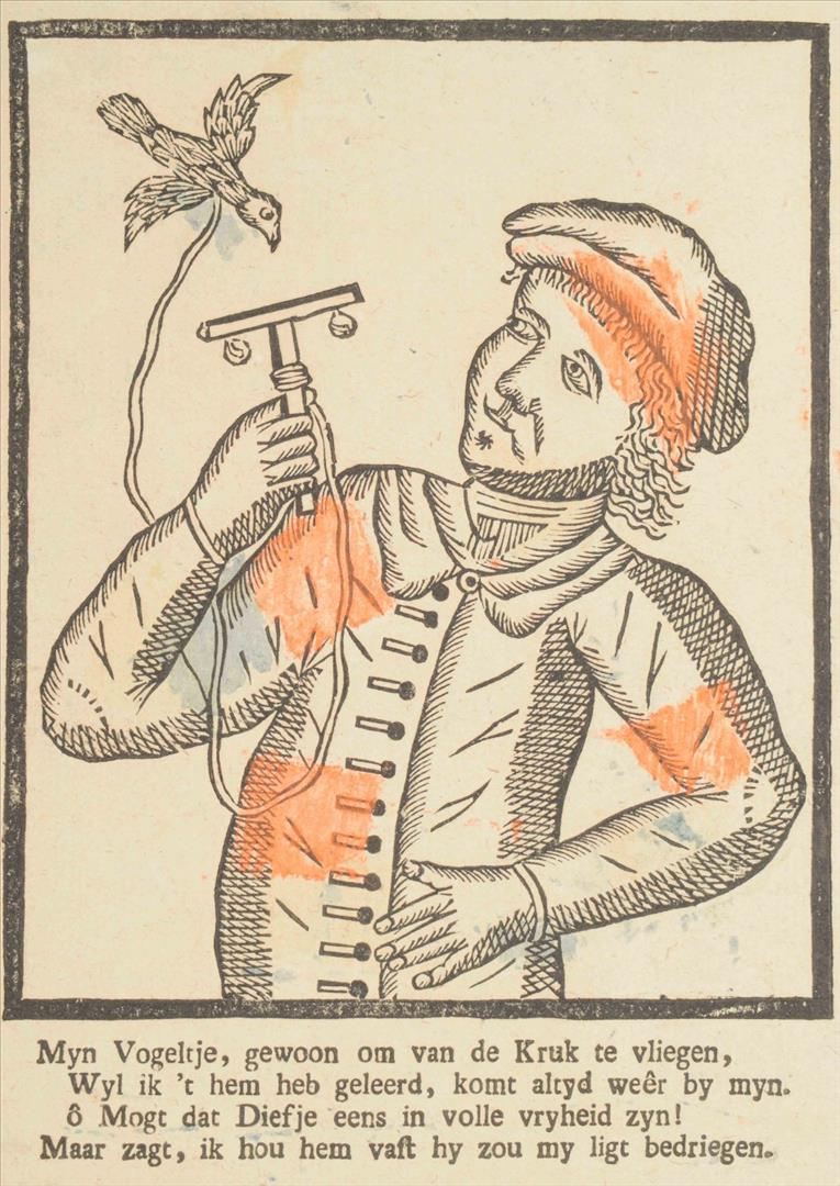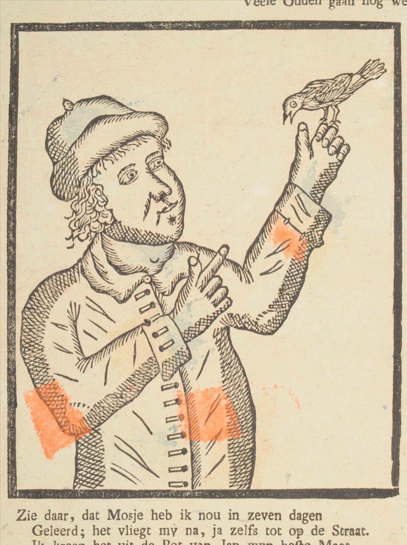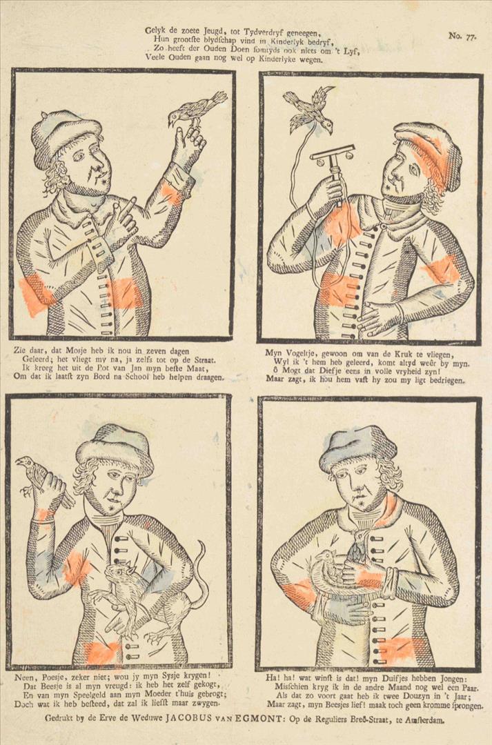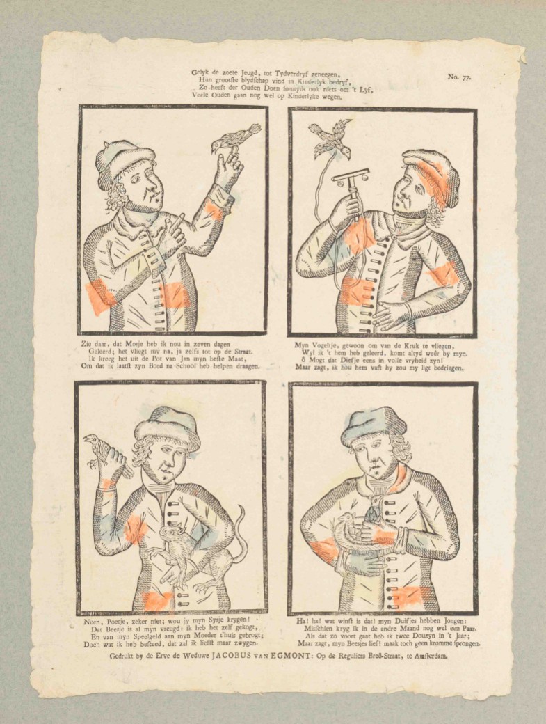 hun grootste blydschap vind in Kinderlyk bedryf (...)." Catchpenny print with 4 thumb-coloured woodcuts depicting children playing with birds and a cat, sheet size 42.5 x 31 cm, topped with letterpress general verse and with specific verses below each woodcut, Amsterdam, heirs of the widow of J. van Egmont, (c. 1790), numbered "No. 77" in upper right corner, mounted at corners.
