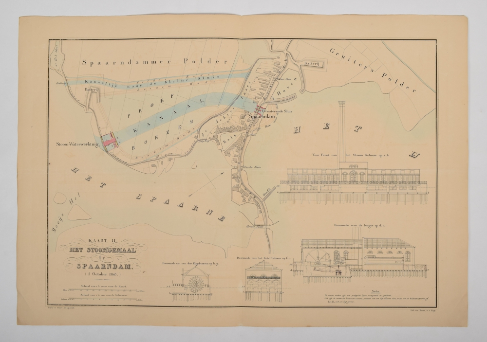 door Jonkhr. Mr. Gevers van Endegeest. Kaart I. Rhijnland en het Haarlemmermeer. Kaart II. Het Stoomgemaal te Spaarndam. Kaart III. Het Stoomtuig de Leeghwater aan de Kaag [title copied from wrapper]. Three handcoloured, lithographed maps by Huart after Bayly & Huart, all 72.5 x 50 cm. (incl. margins), loose as published in original letterpress wrapper, 50 x 36.5 cm (minimal defects).