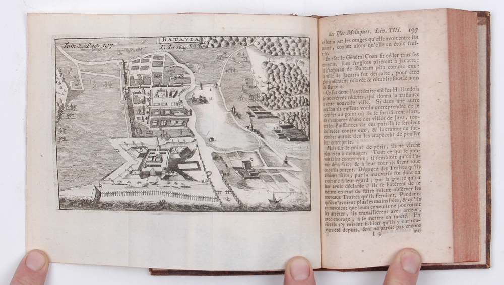 par les Espagnols, par les Portugais & par les Hollandois. Traduite de l'Espagnol [Bartolomé Leonardo] d'Argensola, et enrichie des Figures & Cartes Géographiques por l'intelligence de cet Ouvrage. Amsterdam, Jaques Desbordes, 1706, 3 volumes, (12),405,(3); (2),402,(30); (2),388,(20) p., with 3 identical engraved frontispieces, 8 (large) folding engraved maps and 24 folding engraved views and other plates, contemporary uniform marbled sheepskin, abundantly gilt back with raised bands and morocco letterpiece, large 12mo.