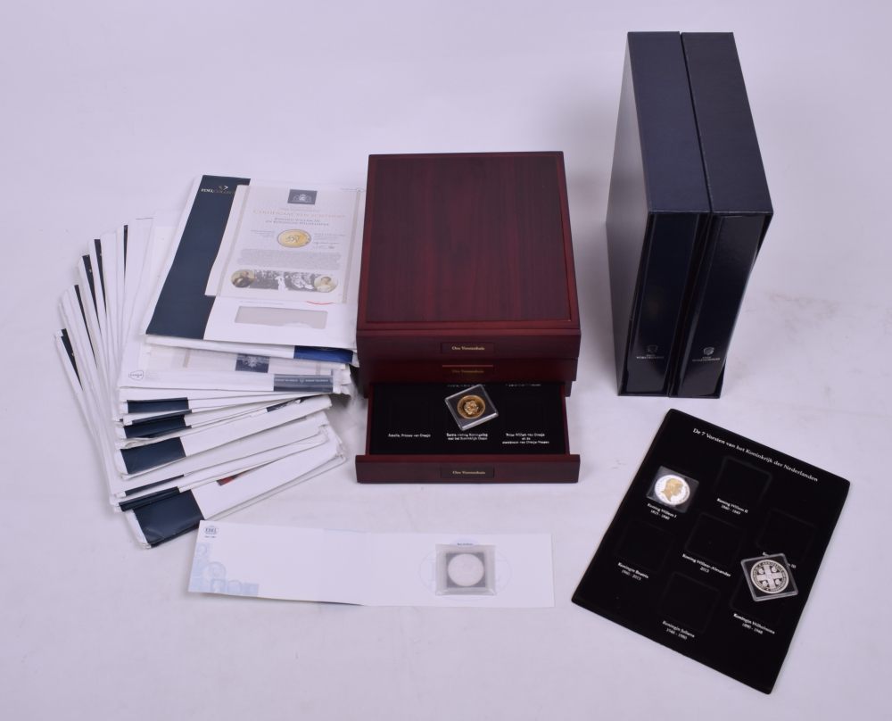 Collection of 27 coins from the series. Heavy silverplating, published by Edel Collecties. With certificates of authenticity. Proof. With: two original binders from the series and three wooden slipcases with title piece "Ons Vorstenhuis" (total 32).