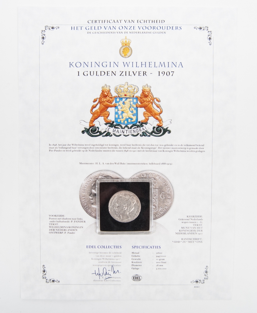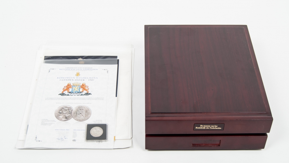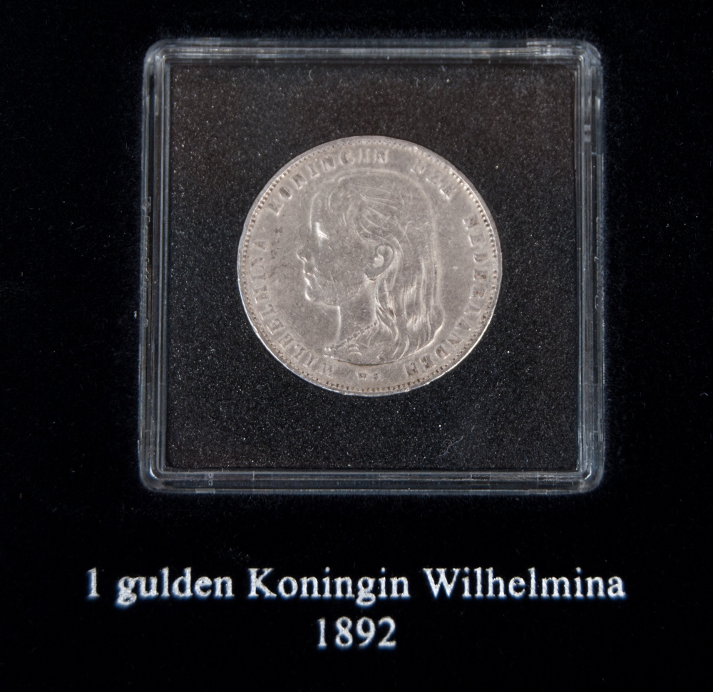 with the silver guilders from 1865, 1892, 1897, 1907, 1908 and 1913. With certificates. Quality: very fine. With: reissue 2 1/2 Gulden 1980 Dubbelportret Juliana en Beatrix. Quality: proof.