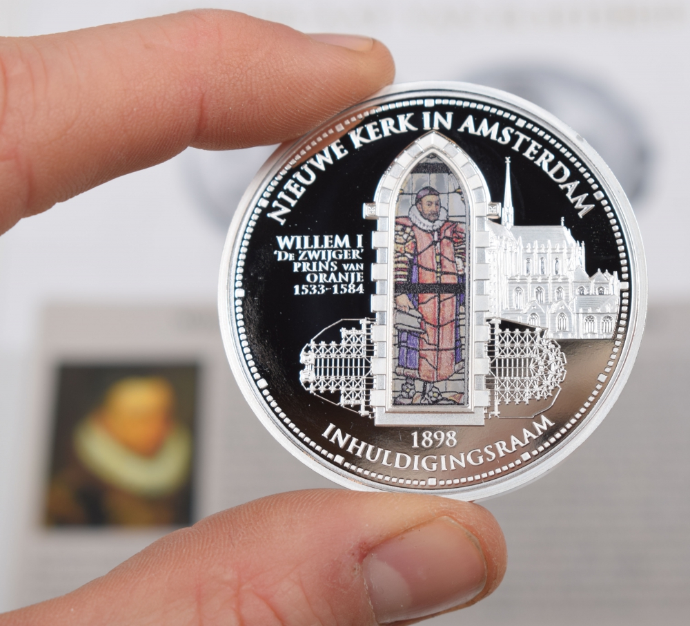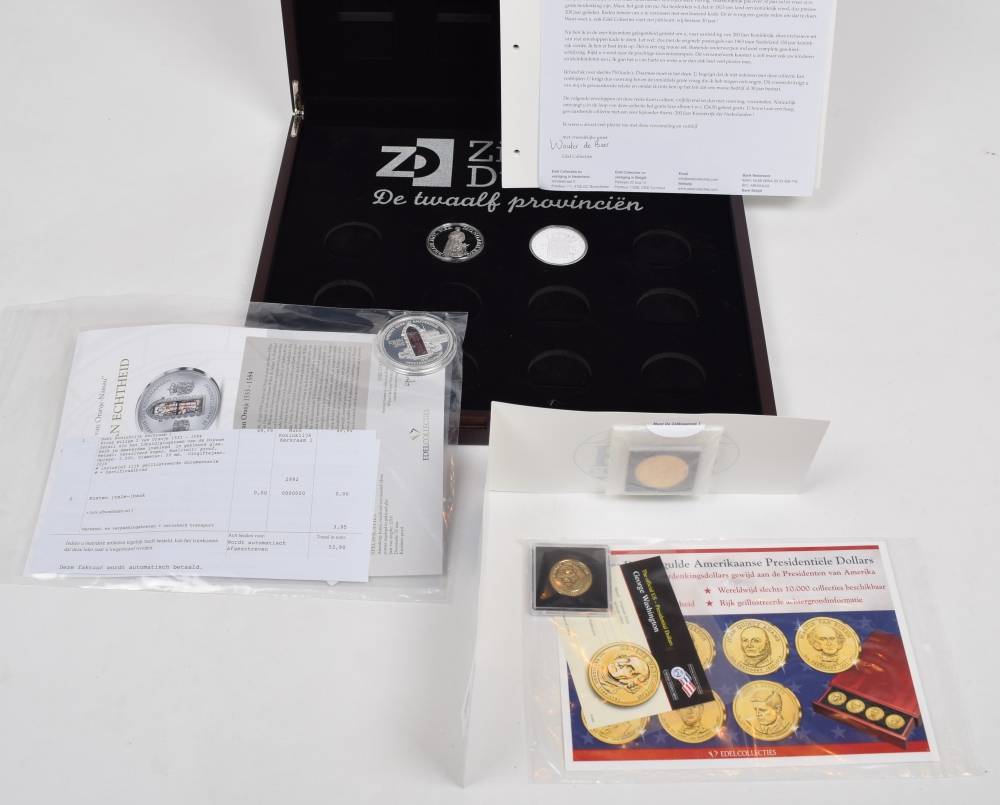 original box with 2 silver provincial coins, quality: proof. With: coin Koninklijk Kerkraam 1. Willem I van Oranje, silverplated, proof. And with: gilded dollar George Washington (2007). And: reissue Dollar Double Eagle from 1933. And finally with sets Herdenkingsenveloppen van Vincent van Gogh and of De Geschiedenis van het Koninkrijk der Nederlanden.