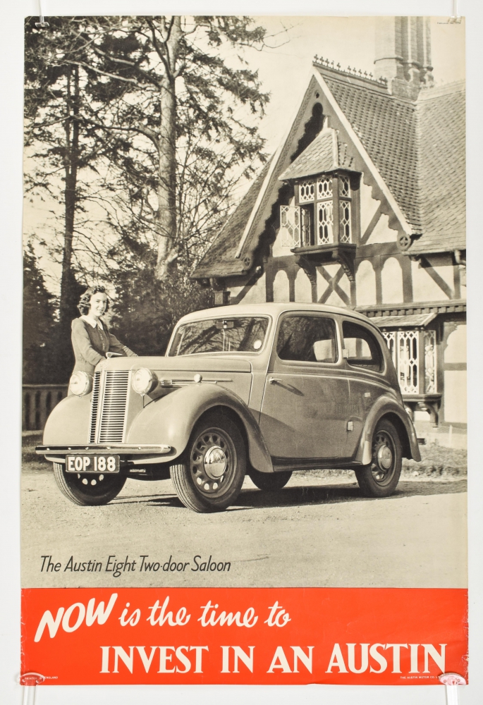 Now is the time to invest in an Austin. Printed in England. The Austin Motor Co. Ltd., Birmingham. Ca. 1939, 76 x 50.8 cm.