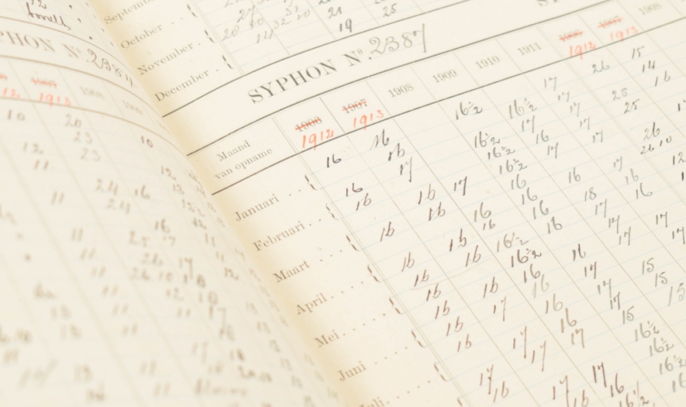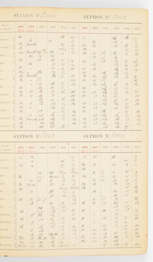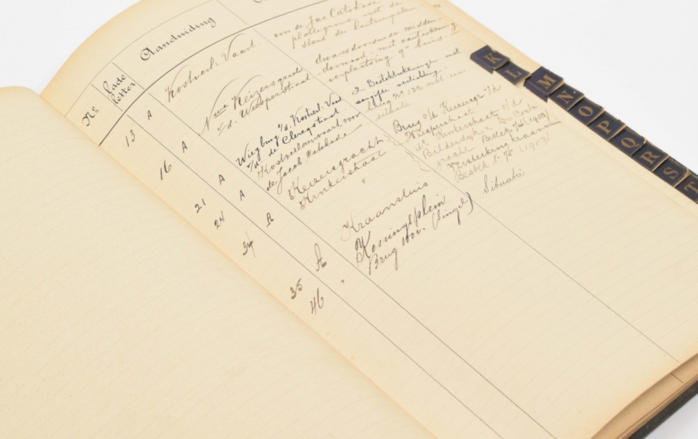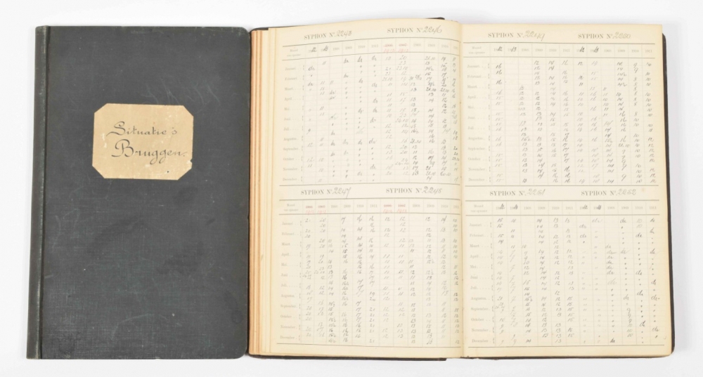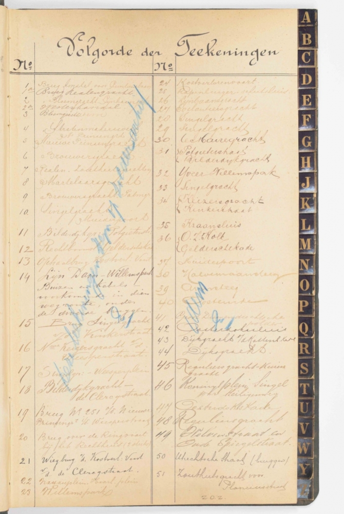 Manuscript index book related to the bridges of Amsterdam, 1902. (2) pp. index of 68 bridges, followed by alphabetically organized leaves with thumb index, each letter with a list of bridges and a short description of each bridge. Partly unwritten; a few later corrections/deletions in coloured pencil + book of culvert syphons, 1913. Pre-printed leaves filled out by hand, each syphon numbered and with a table describing its condition and capacity from 1908 to 1913.