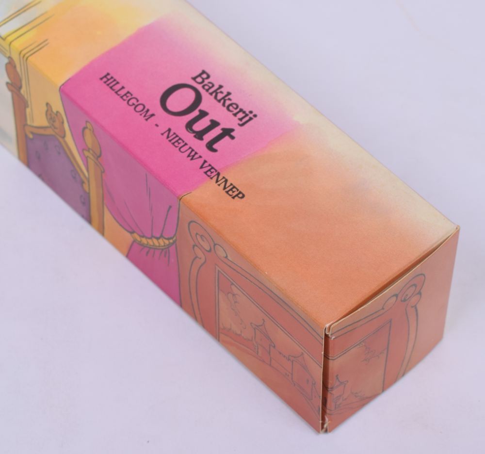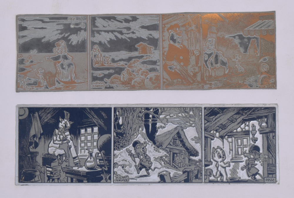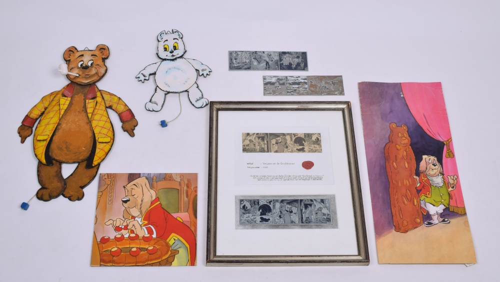 Cliché Tom Poes en de grootdoener, framed under glass, with imprint in newspaper strip and additional written text + another 2 clichés - and 8 pastry boxes with Toonder images - and 2 puppets (jumping jacks), handmade by fan.