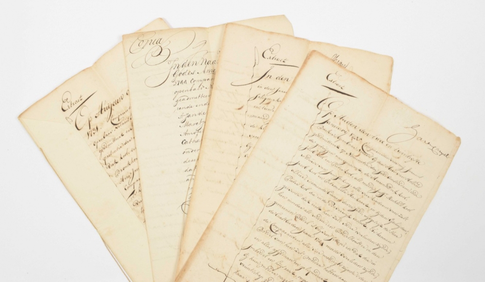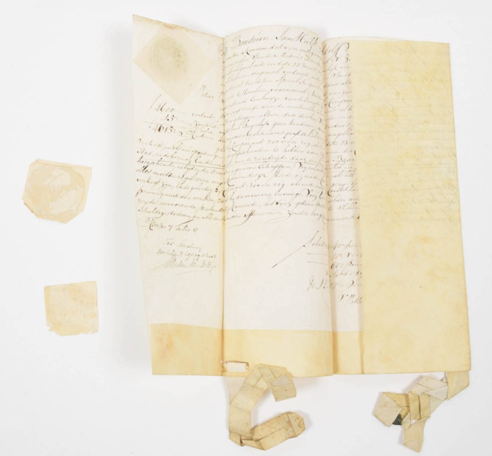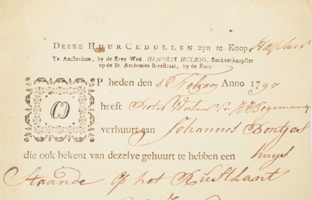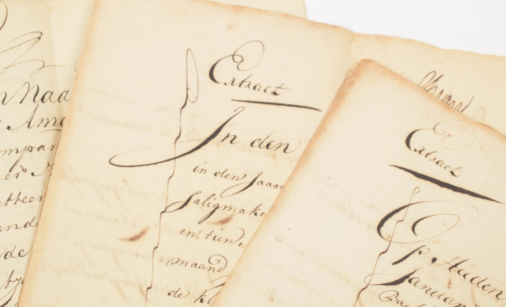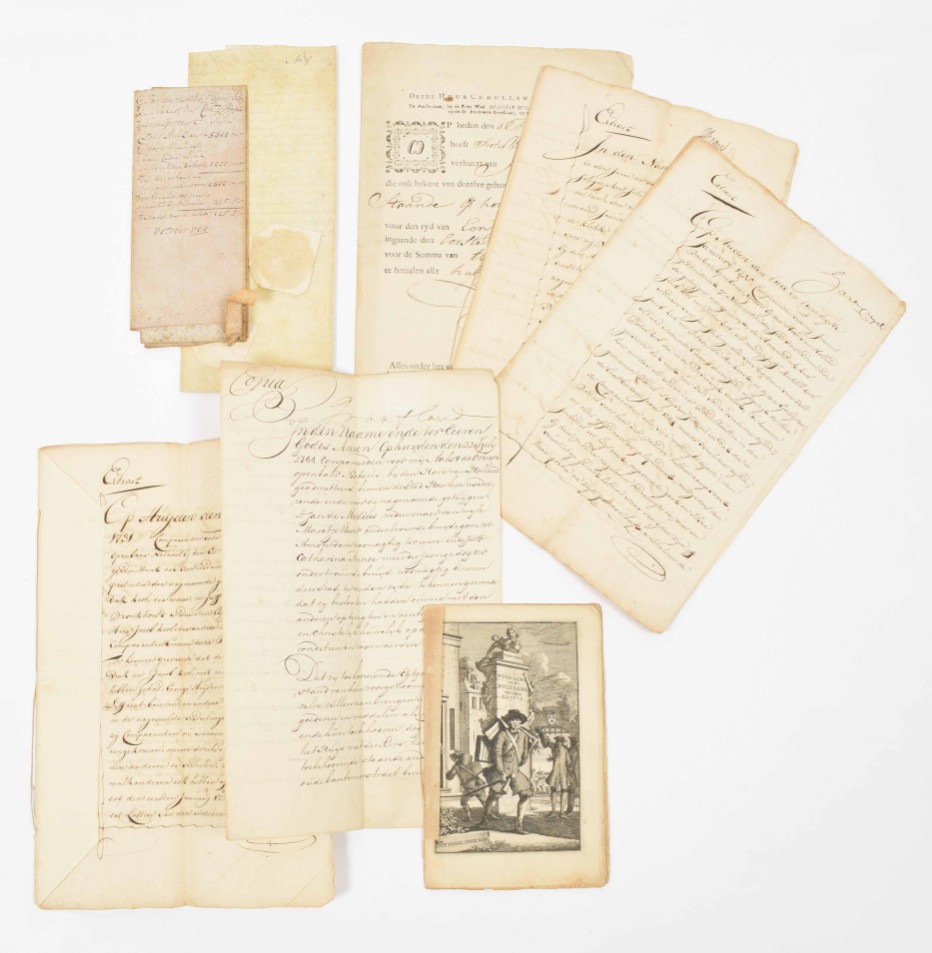 Lot with 7 deeds, mostly manuscript, partly printed. Incl. a rental deed from 1795, extracts of marital acts and wills from 1734 etc. All from Amsterdam and surrounding towns such as Oostzaan and Haarlem.