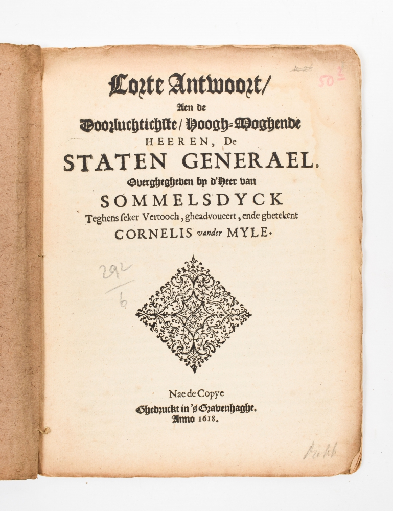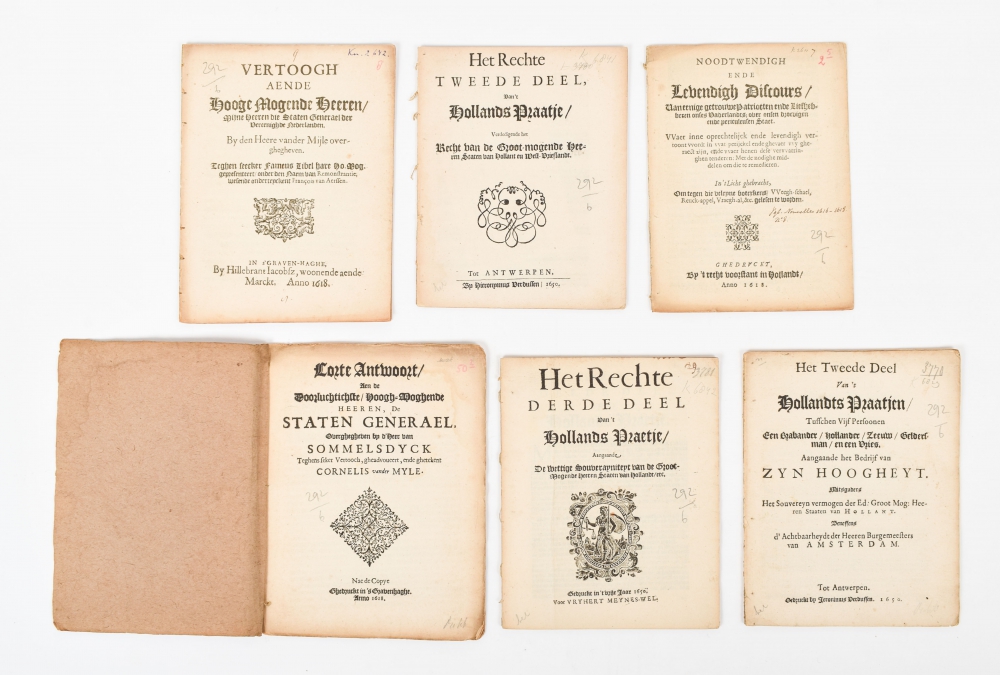 (1) Vertoogh aende Hooge Mogende Heeren. Mijne Heeren die Staten Generael der Vereenighde Nederlanden. By den Heere vander Mijle overghegheven. Den Haag, Hillebrant Jacobsz, 1618; (2) Corte Antwoort aen de Doorluchtichste Hoogh-Moghende Heeren, De Staten Generael overghegheven by d'Heer van Sommelsdyck (...) ghetekent Cornelis vander Myle. Den Haag, 1618; (3) Het tweede Deel van 't Hollandts Praatjen tusschen vijf persoonen (...). Antwerpen, J. Verdussen, 1650; (4) Het Rechte Tweede Deel van 't Hollands Praatje. Antwerpen, H. Verdussen, 1650; (5) Het Rechte Derde Deel van 't Hollands Praetje. Vryhert Meynes-wel. 1650; (6) Noodtwendigh ende Levendigh Discours (...) By 't recht voorstant in Hollandt. 1618.