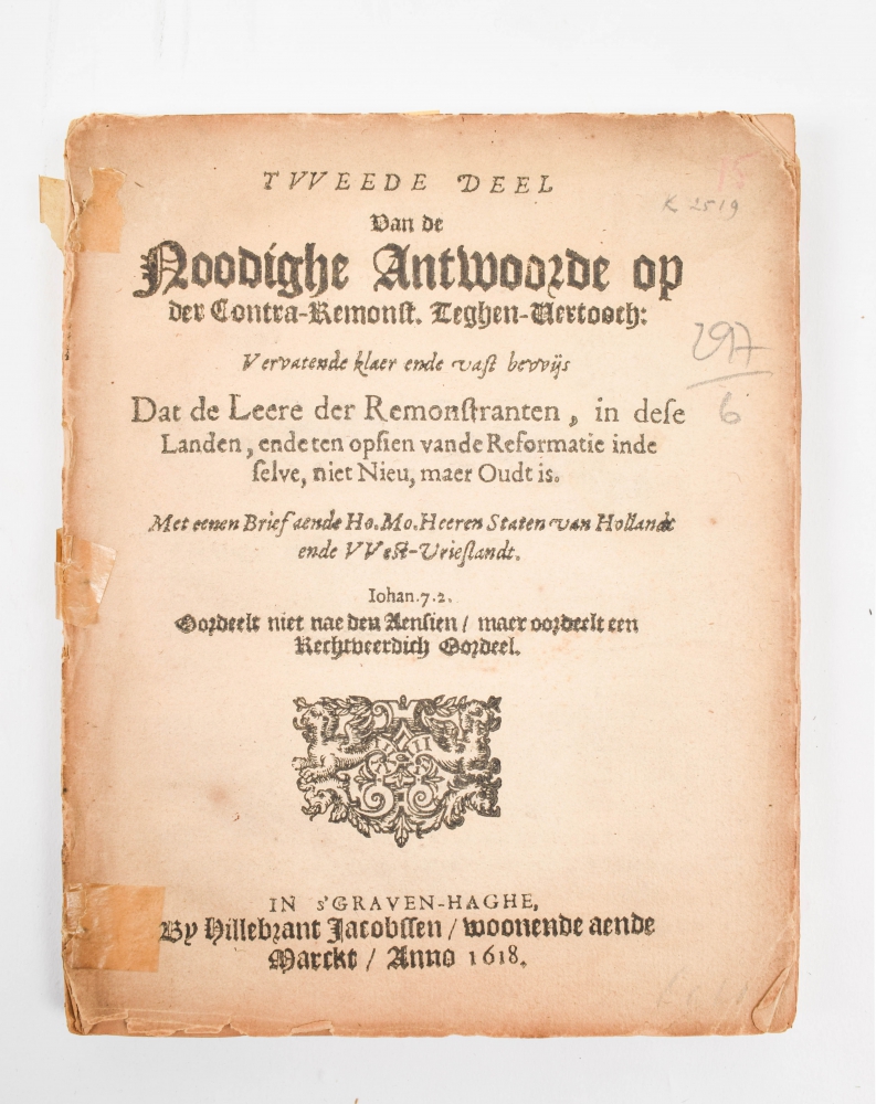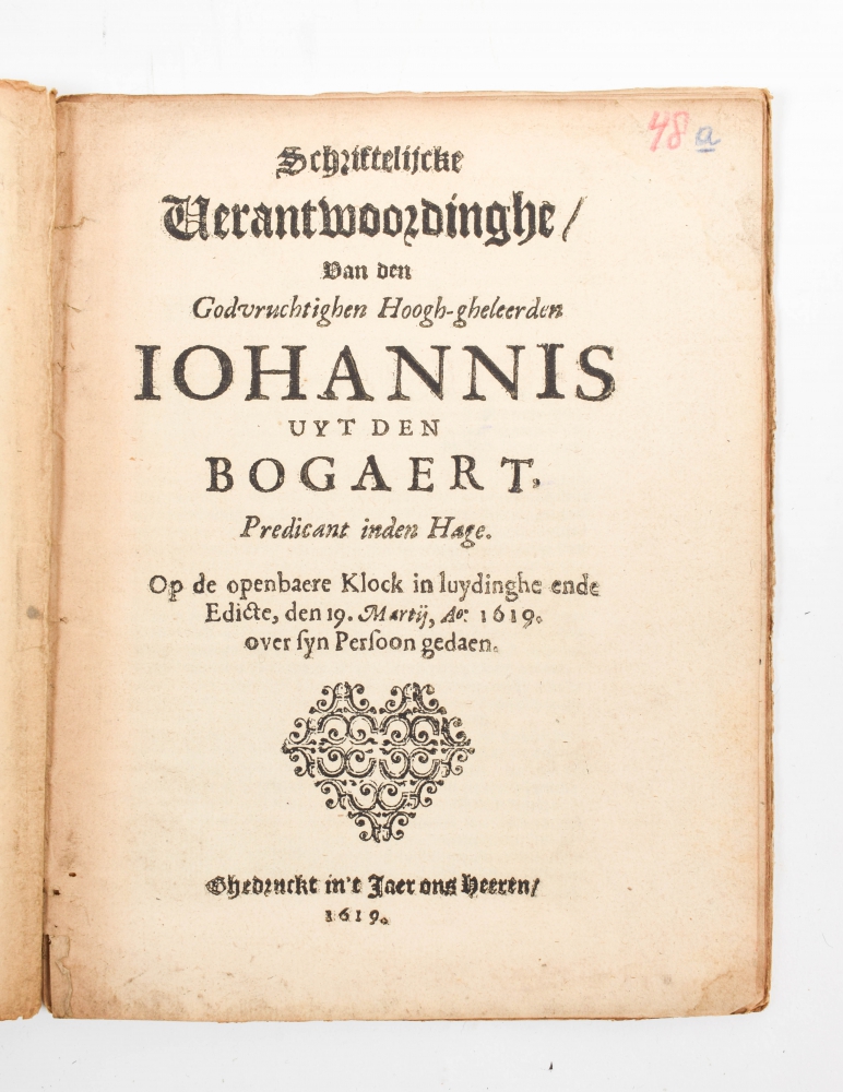 (1) Schriftelijcke Verantwoordinghe van den Godvruchtigen Hoog-gheleerden Iohannes uyt den Bogaert. 1619; (2) Tweede Schriftelijcke Verantwoordinghe van den Godvruchtigen Hoogh-gheleerden Iohannes uyt den Bogaert. 1619; (3) Idem; (4) Copye van een Missive den II Aprilis 1619, aen eenen particulieren ende oudt-bekenden vrient afgeveerdicht door (...) Iohannem Wten Bogaert. 1619; (5) Idem; (6) Tweede Deel van de Noodighe Antwoorde op der Contra-Remontst. Teghen-Vertoogh. Den Haag, Hillebrant Jacobssen, 1618.