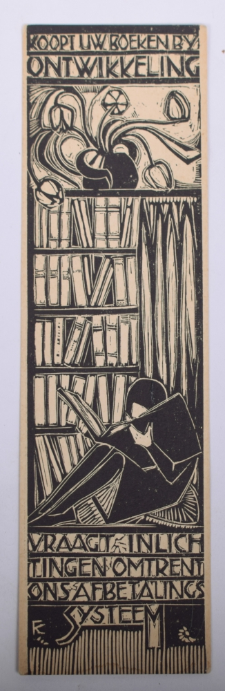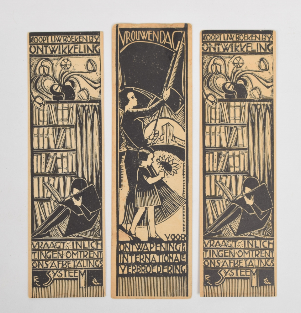 Three bookmarks illustrated by Cohen. 1. Wat bloemen zyn voor onzen tuin zyn boeken voor ons leven 2. Vrouwendag. Voor ontwapening en internationale verbroedering. 3. Koopt uw boeken by ontwikkeling. Vraagt inlichtingen omtrent ons afbetalings Systeem.