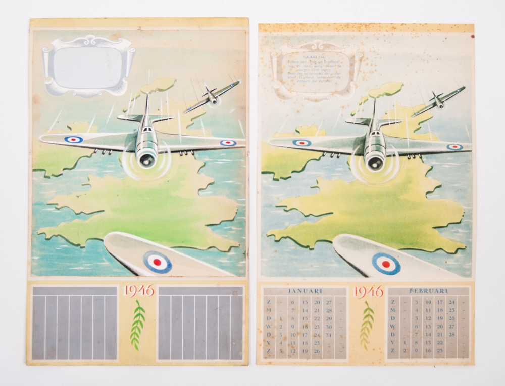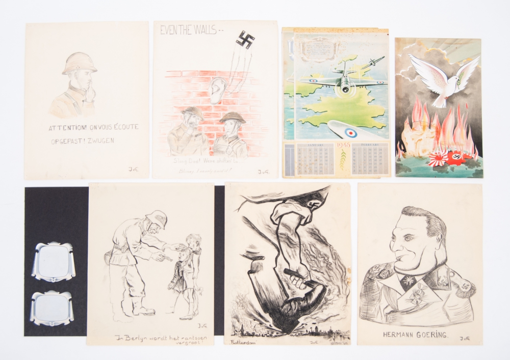 7 original caricatural WWII drawings, signed J.V.G. with inscriptions such as: "In Berlijn wordt het rantsoen vergroot!" and: "De muren hebben ooren". All 32 x 25 cm. + 2 original watercolours for 1946 calendar conc. the war - and the first drawing in print as calendar leaf.