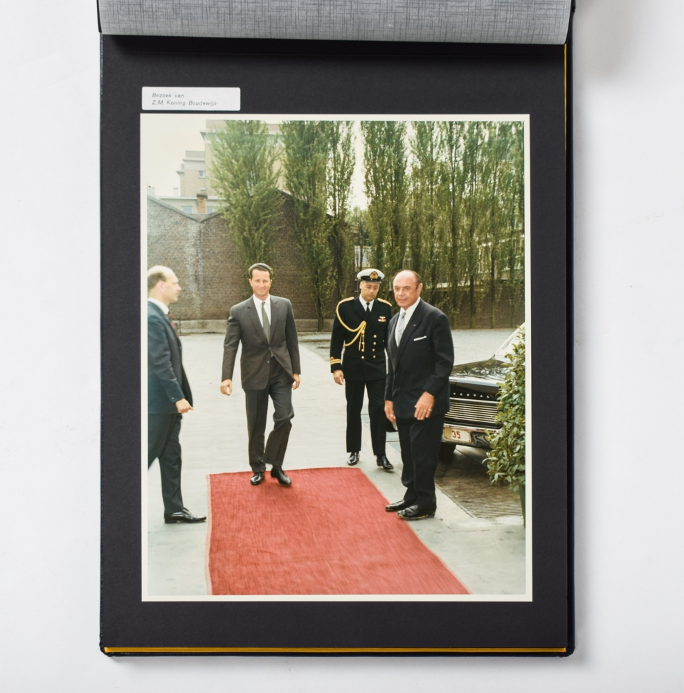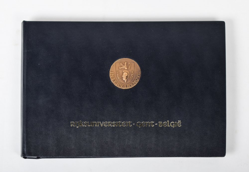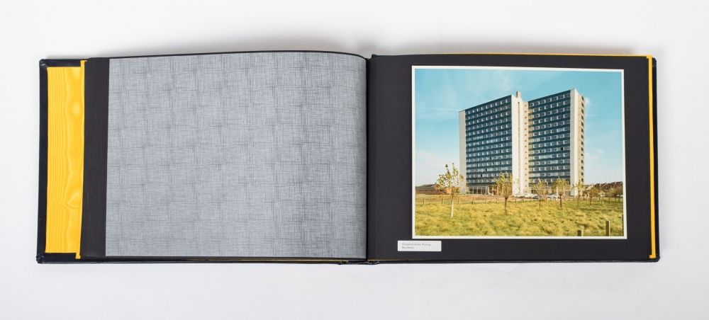 Ca. 1980. Deluxe faux-leather album with inlaid medal, oblong in cassette. Inside the album 23 photos of faculty locations etc.
