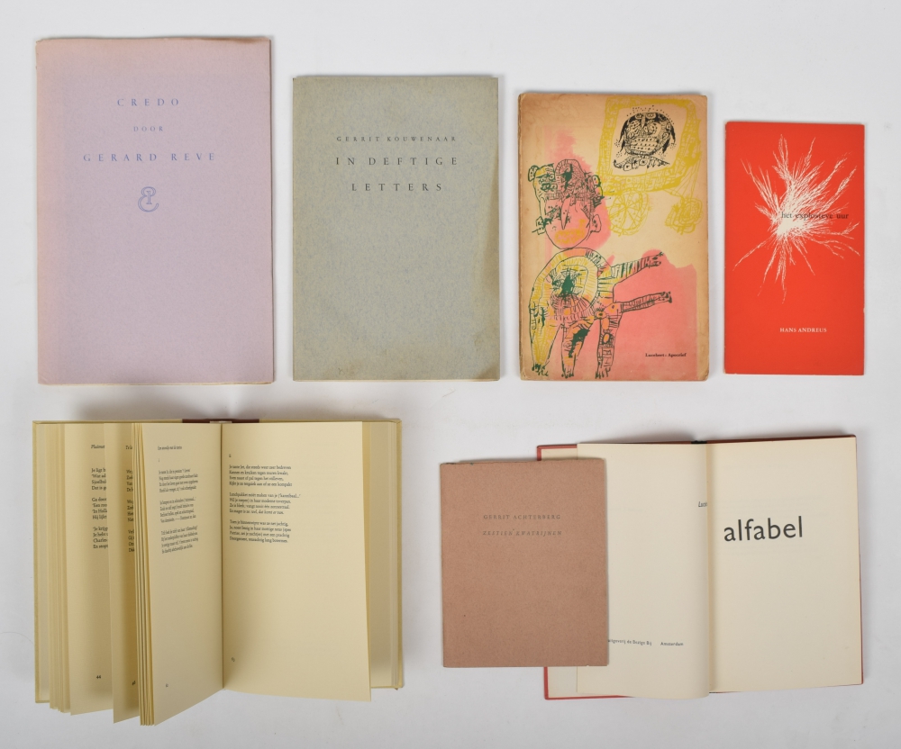 (2) Gerrit Komrij. Het schip De Wanhoop. Gedichten 1964-1979. Amsterdam, De Arbeiderspers, 1979, 148 p., one of 70 deluxe copies in half leather (50) with signed etching by Ch. Hofman, and signed in the colophon by author and artist (boards waterstained, lacks cassette); (3) Lucebert. Alfabel. Amsterdam, De Bezige Bij, n.d. (1955), (4),34,(3) p., original illustrated boards with cloth back (discolouring/ stains). And with 4 more, incl. 2 titles by Eliance Pers (total 7).