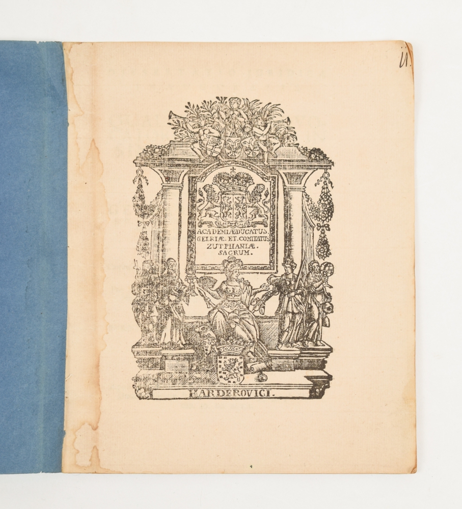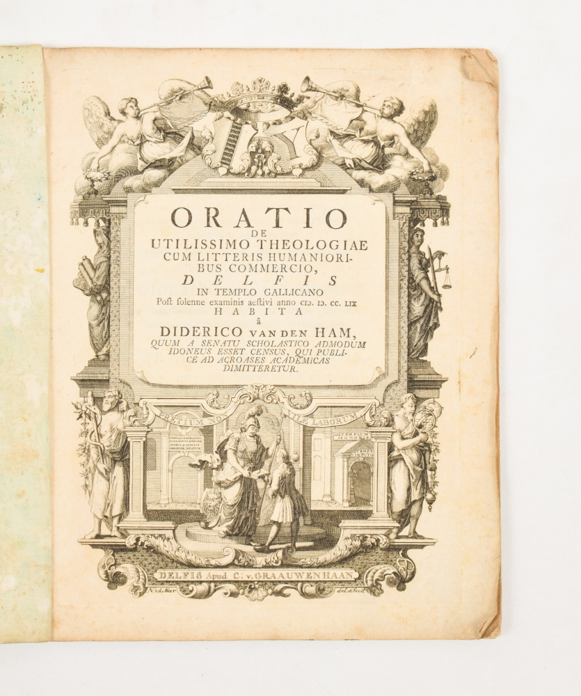 (2-3) Instructie voor de schoolmeesters van de vier parochie schoolen der stad Utrecht./ Reglement en ordre op de parochie schoolen der stad Utrecht. Utrecht, J. van Pollsum, 1752, 2 publications in one volume, both (11) p. and with woodcut (title) vignettes, 19th-century cardboard with cloth back, 4to; (4) Dichterlijk tafereel van den tegenwoordigen watersnood en desselfs treurige gevolgen door Mr. E.J.B. Schonk, rector der Latijnsche Schoolen te Nijmegen. Nijmegen, A. van Goor, 1799, (2),41 p., original (?) cordbound wrapper (vaguely waterstained (fittingly) and shabby copy, untrimmed). And with 5 more (total 9 in 8 volumes).