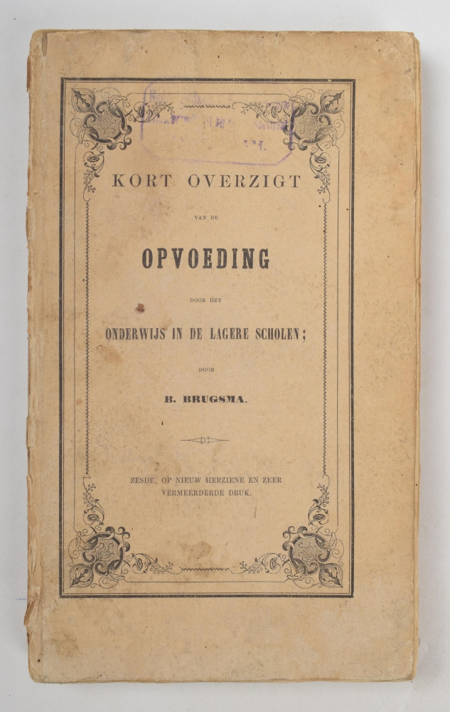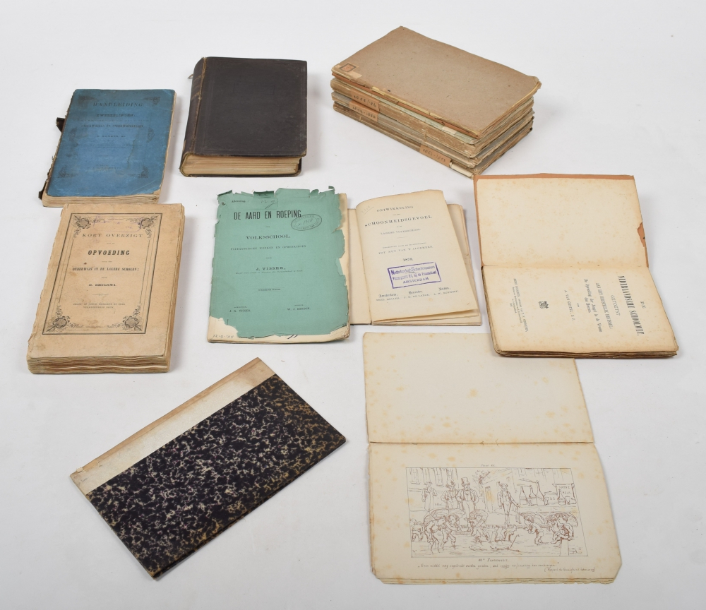 With annotation on title page: "Geschenk van den hr. F.A.R. Beekman"; (2) Bijdrage tot de geschiedenis van het vaderlandsche schoolwezen in de voorgaande eeuw, door Dr. A. de Jager. Rotterdam, Altmann & Van der Palm, 1855, (4),76 p., original wrapper; (3) Kort overzigt van de opvoeding door het onderwijs in de lagere scholen; door B. Brugsma. Zesde (...) druk. Groningen, A.L. Scholtens, 1857, VIII,300 p., original cardboard; (4) Handleiding voor kweekelingen, aankomende en jeugdige onderwijzers en onderwijzeressen; door H. Hemkes. Vierde (...) druk/ Delft, W.N.C. Roldanus, 1862, VIII,257 p., original cardboard; (5-7) Verslag nopens den staat der hooge-, middelbare en lagere scholen in het koningrijk der Nederlanden. over 1849-1850/ 1852-1853/ 1855-1856. The Hague, Algemeene Lands-Drukkerij, 1851-1857, 3 volumes, with many folding tables, contemporary uniform cardboard; (8) De aard en roeping der volksschool/ Paedagogische wenken en opmerkingen door J. Visser. Tweede druk. Gorinchem/ Assen, J.A. Visser/ W.J. Gordon, n.d. (1882), 2 parts in one volume, IV,289,(3); 314,(2) p., contemporary cloth (with separately added the first issue of the same work with annotations by the printer and the publishers). And with 5 similar works (total 14).