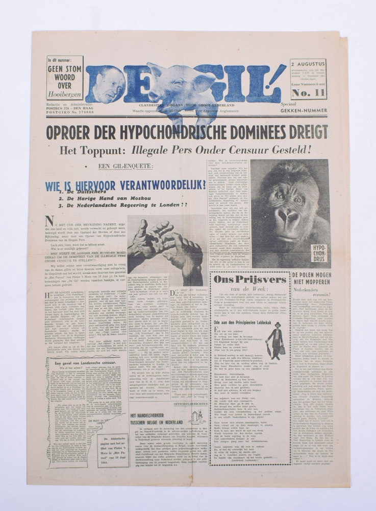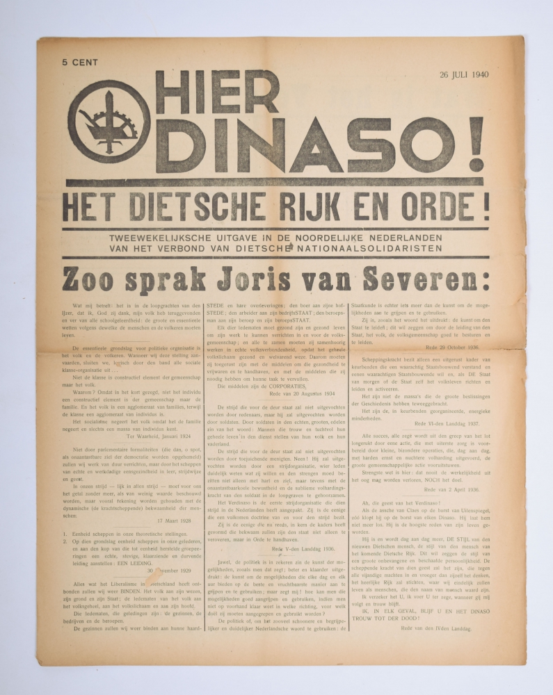 Contains e.g.: 76 issues of Het Nationale Dagblad, 1939-1945; De Gil no. 1-14 (lacks no. 9), 1944; 2x Speciale extra-editie De Gil (of which 1 offprint, underground response to De Gil); 4 issues of Hier Dinaso! Het Dietsche Rijk en Orde!, 1940; Het Vuurslag, Orgaan van den Nationalen Bevrijdingsstrijd, Belgium, no. 25, 1939; and 2 issues of Evangelie en Volk, 1941 (total ca. 110).
