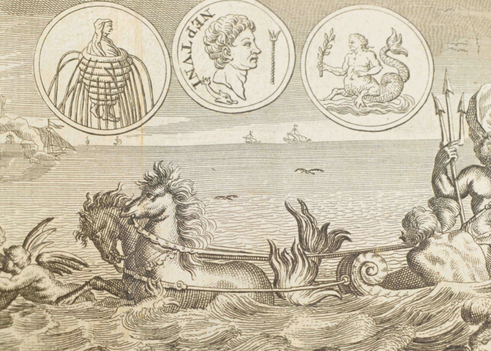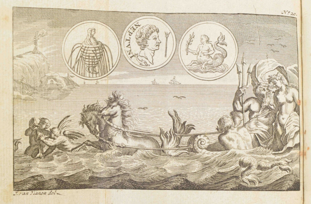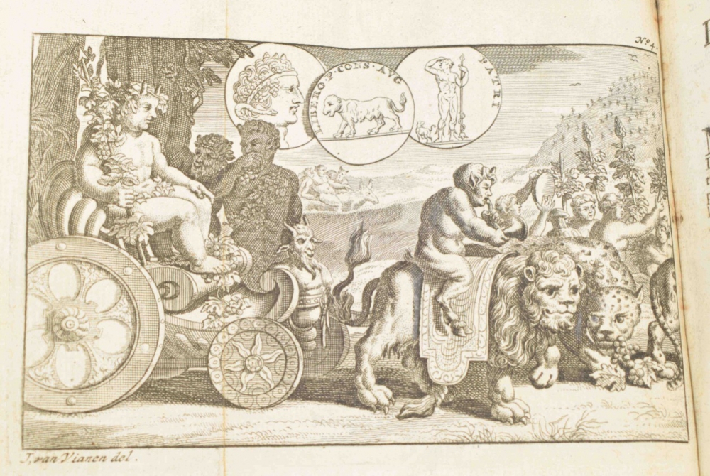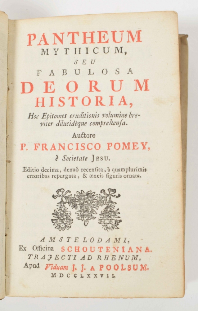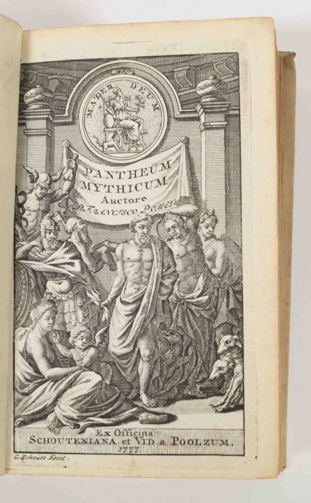 Lacks ties; sm. stain on front cover. Extremely rare early Gorinchem prize binding, not in Spoelder (listing 2 Gorinchem stamps dated 1739 and after 1788, with the pennants on the gate pointing to the left, ours pointing to the right and also differing in other details). With handwritten prize dated 12 August 1694, signed by rector Adrianus Laeckervelt and by Joannes Übelman and Hendr. van Barnevelt. On: Publ. Terentii Comoediae VI cum notis Th. Farnabii (et M.C. [Mercius Casaubonus] (...). Amsterdam, Ex officina Ianssonio Waesberginana, 1681, (36),279,(6) p., with engr. title p.; (2) Full gilt vellum binding, both covers with the large central coat of arms of Arnhem, sm. 8vo. Lacks ties and sl. stained. With letterpress prize certificate filled out in pen, awarded to Joannes Gulielmus Goedhart, dated 1808, signed by rector Van Rhede and by 2 others. Spoelder, Arnhem 2. On: Pantheum mythicum, seu Fabulosa deorum historia (...) Auctore P. Francisco Pomey (...). Editio decima (...). Amsterdam/Utrecht, Schouten/widow of J.J. a Poolsum, 1777, (16),298,(14) p., with engr. frontisp. and 27 (fold.) engr. plates (all according to the "Index tabularum"). (total 2)