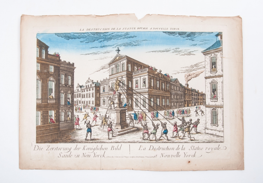 La destruction de la statue Royale a Nouvelle Yorck. Paris. J. Chereau. [Ca. 1780]. 27.5 x 40 cm., copper engraving, coloured. Inscription in German and French. Top edge paper damaged; print unaffected.