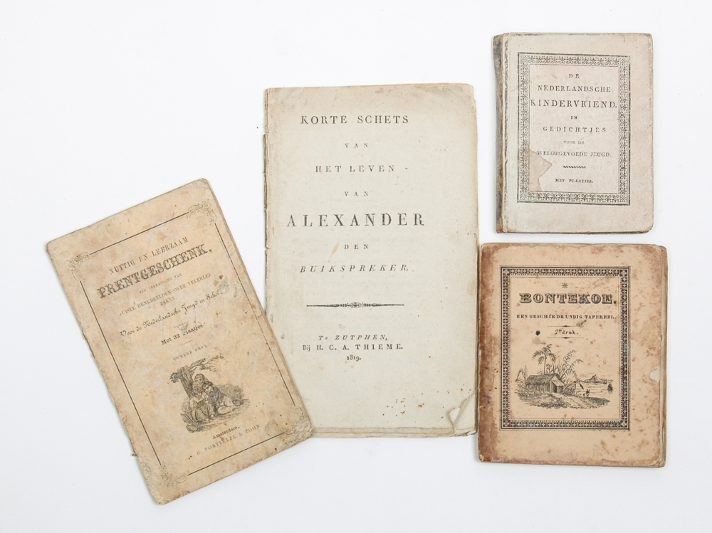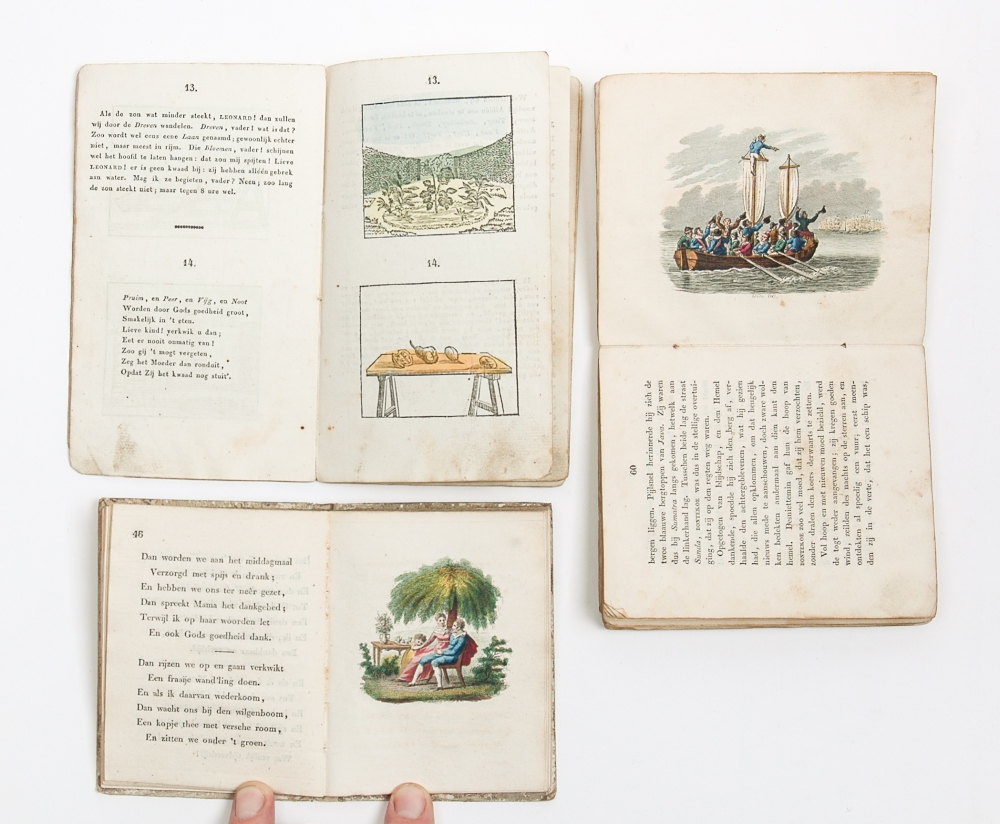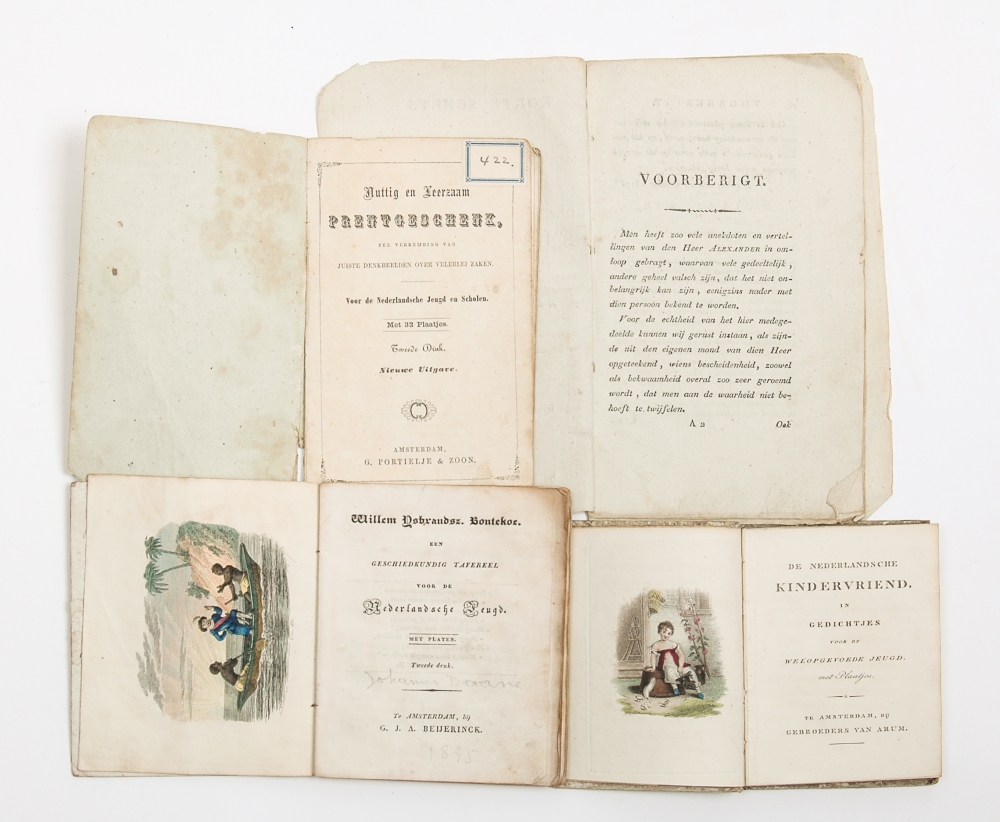 voor de Nederlandsche Jeugd. Met platen. 2de druk. [Johannes Daane], Amsterdam, G.J.A. Beijerinck, ca. 1835. 72 pp. 8vo. Slightly soiled copy, pictures in good condition + Nuttig en leerzaam prentgeschenk ter verkrijging van juiste denkbeelden over velerlei zaken. Voor de Nederlandsche Jeugd en Scholen. Met 32 plaatjes, tweede druk. Amsterdam, G. Portielje & Zoon, ca. 1840. Exterior slightly weathered, interior good. With 32 handcoloured woodcuts and texts + De Nederlandsche kindervriend in gedichtjes voor de welopgevoede jeugd. Met (6) plaatjes. Amsterdam, Gebr. van Arum, ca. 1840. 8vo, with prof. restored back - and Korte schets van het leven van Alexander den buikspreker. Zutphen, H.C.A. Thieme, 1819. iv, 40 pp. Without binding as published.