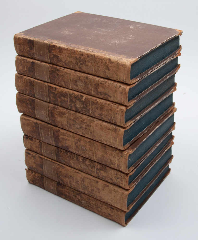 Dediée a Monseigneur le Duc d'Orleans (...) par MM. D*** [Dujardin] [8 volumes]. Paris. P.G. Simon. 1757-1770. 4to, half leather, uniformly bound, illus. frontispiece by L. Lempereur after C. Eisen, 8x title in red and black with vignette and more than 4000 pp. text, 6 folding maps incl. the highly interesting map of the coasts of Papua New Guinea, 3 prints and 52 portraits, all in copper engraving besides numerous head- and tailpieces. Complete series. Bindings with minor imperfections.