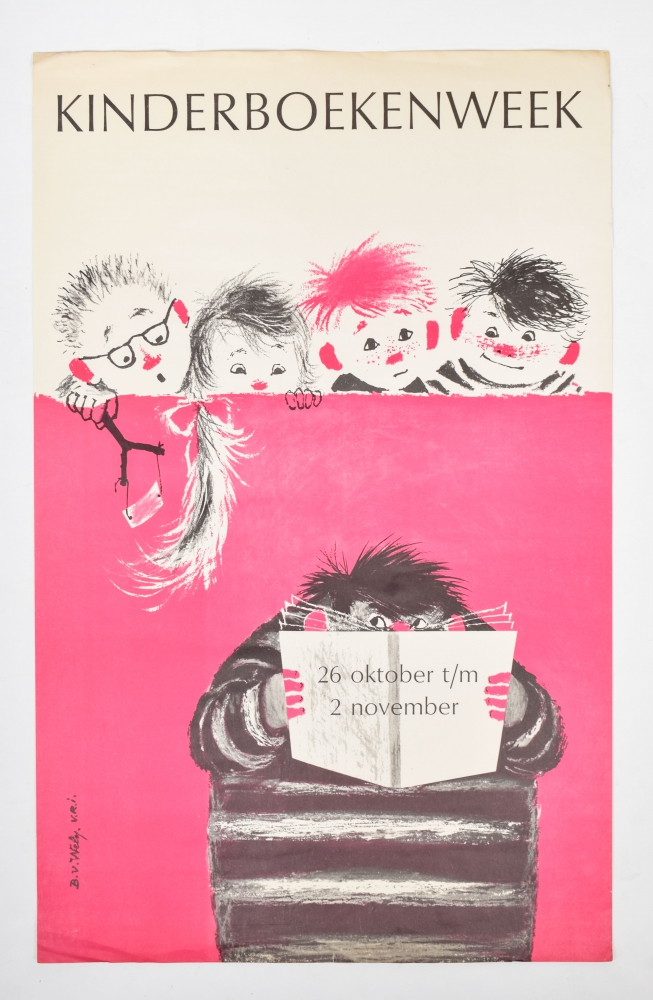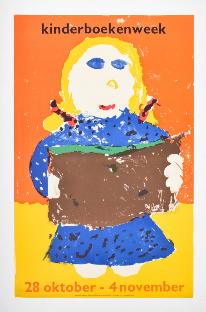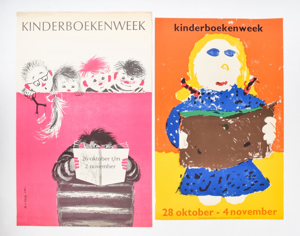 26 oktober t/m 2 november. Design B. [= Babs] v. Wely, v.r.i. 1963. 71 x 45 cm. Minimal dam. top and bottom. Good copy + Kinderboekenweek 1959. Design Aletje van Leeuwen, 6 years old. 66 x 42 cm. Good copy.