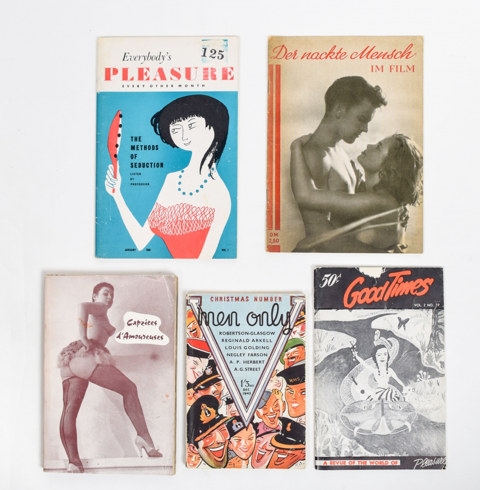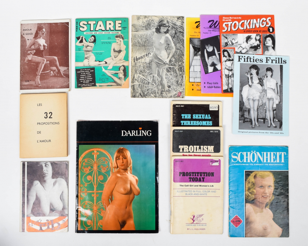 Lot with 38 erotic magazines between ca. 1950 and 1972. Incl. Amour a gogo no. 2, 1956 + Arcanes 4 numbers, 1967 + Diskret, Herrenmagazin, 2 nos. ca. 1970 + Der Nackte Mensch im Film, eine Kritische Studie von Dr. Konrad Karkosch, Richard Danehl's Verlag, Hamburg, 1954 - and 30 more.