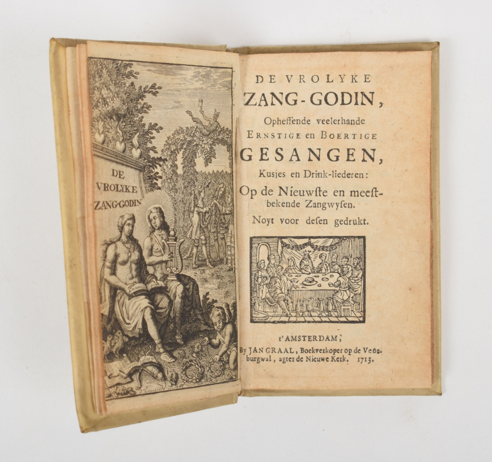 opheffende veelerhande Ernstige en Boertige gesangen, Kusjes en Drink-liederen: op de Nieuwste en meest-bekende Zangwysen. Noyt voor desen gedrukt. Amsterdam, Jan Graal, 1713, (2),160,(4) p., with engraved frontispiece, contemporary vellum, 12mo.
