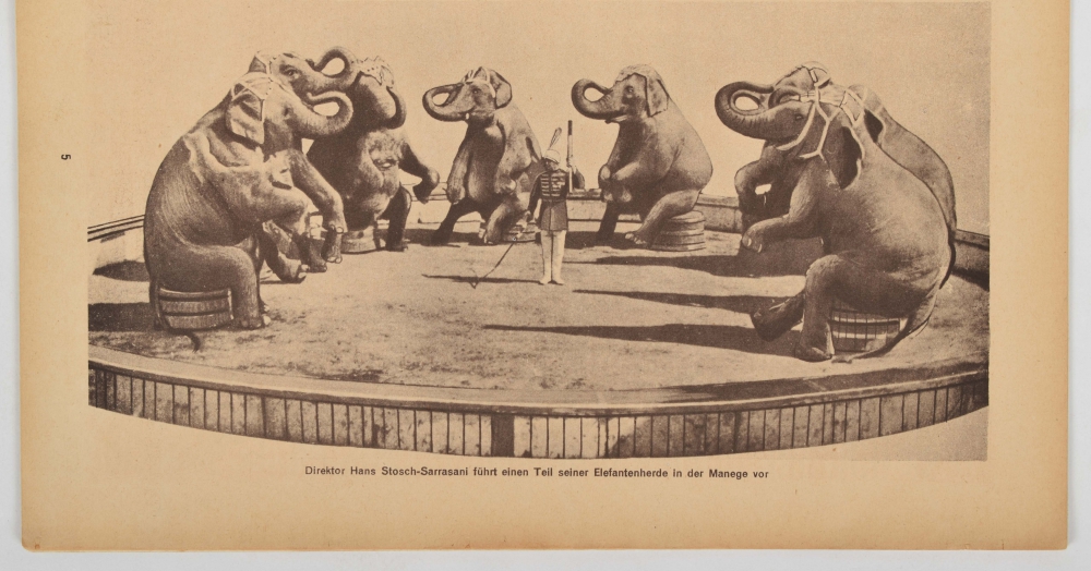 Heft 1-6, several editions, '30s. Sarrasani. Zur Erinnerung an die 30. Wiederkehr des Gründungstages des Zirkus Sarrasani. Vol. 1-5: Mit Sarrasani in Südamerika. Vol. 6: Sarrasani der Mann, sein Name, sein Werk. Ernstes und Heiteres aus Sarrasanis Zauberreich. In original half cloth file with ties.