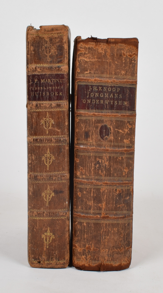 Water stain in inner margin at the beginning, here and there slightly browned/ foxed, binding with some wear/ tears in the leather yet still a good copy of a rare work. The first edition appeared in 1756-1759. This copy was originally part (letterpiece numbered I) of a set of uniform bindings, but complete in itself. Lovely, very extensive manual for young adults regarding arithmetics, bookkeeping, letter writing, drafting obligations and contracts, geometry, surveying, mapmaking, solid geometry, etc. See also lot 525; (2) Huisboek voor vaderlandsche huisgezinnen, door Johannes Florentinus Martinet, meester der vrije konsten (...). Amsterdam, J. Allart, 1793, (8),546 p., contemporary half calf, gilt and ribbed back with morocco letterpiece. With notes dated 1898 in blue pencil on inside front board, binding with some wear, backstrip lacks a small piece at the top. Still a good, untrimmed copy of the first edition, reprinted in 1803 and 1831 (total 2).