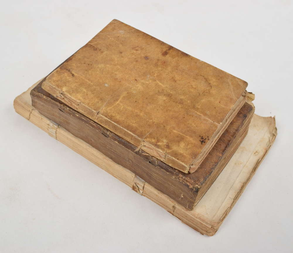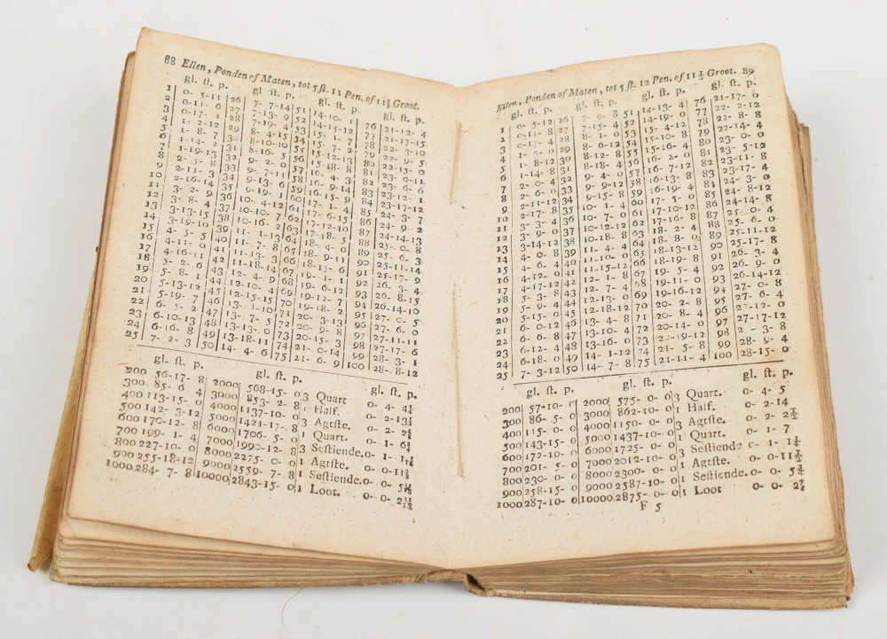 Wormhole at the end and in back cover, content partly tender and minor other defects. With lovely old ownership marks of 15-year-old Jan van Sandijk, dated 13 March 1816. Rare preparation for commerce for teenagers; (2) Koopmans en winkeliers hand-boekje, waar in men met een opslag kan zien, als men weet tot wat prys 't stuk, de el, het pond, of wat het ook zyn mag, gekogt is; hoe veel de somma van de geheele koop bedraagt. Zeer dienstig voor alle kooplieden, suiker- handelaars (...). Deze druk van Fouten verbeeterd. Amsterdam, P. van Dorth, 1793, (8),334 p., contemporary vellum (quire M. damaged, final leaf loose, sold w.a.f. With publisher's signature for approval). And with one more: (3) Kort, dog duidelijk onderwys van 't Italiaansch boekhouden (...) door J.P. Aubert (fourth edition 1782, no binding) (total 3).