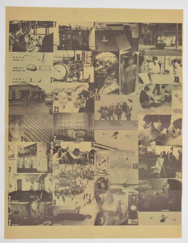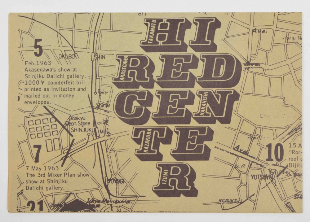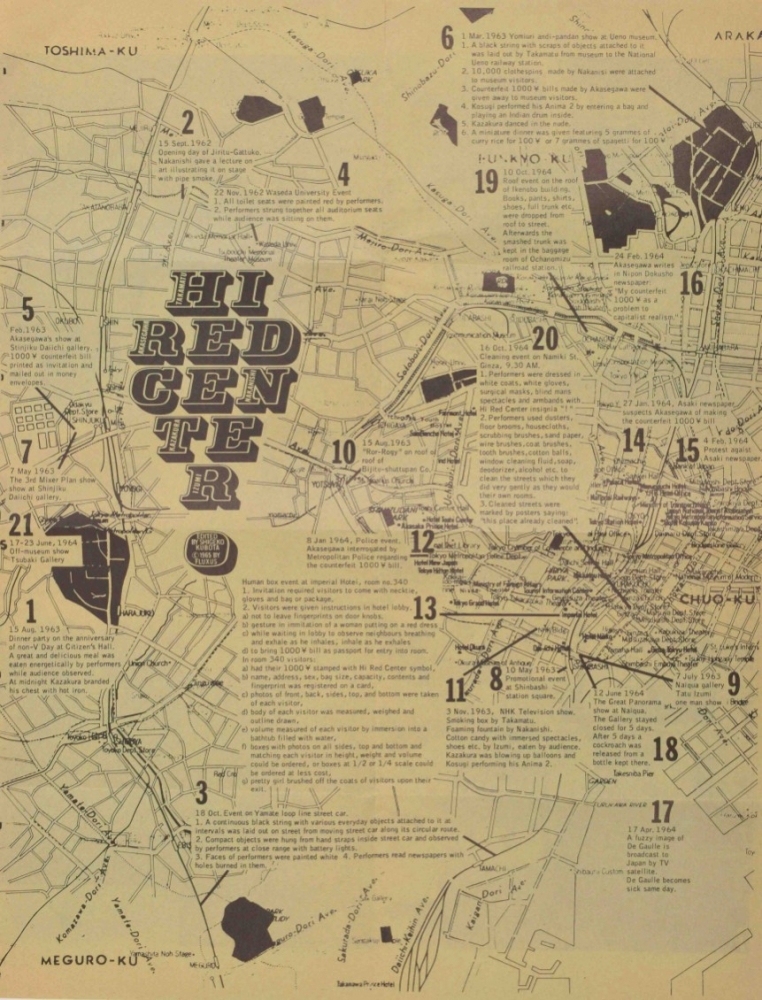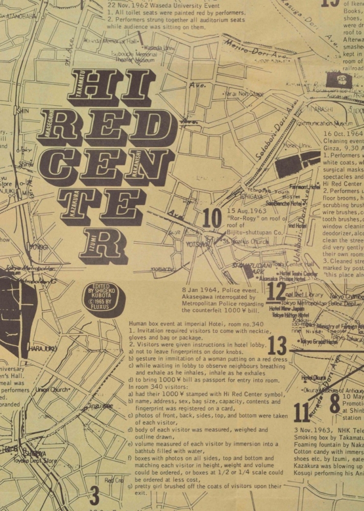 New York City, Fluxus Editions, 1965. Offset litho, black on grey-green sheet. 56 x 43 cm, folded in 8. Edited by Shigeko Kubota, designed by Maciunas. Double-sided poster featuring a map of central Tokyo with the sites and documentation of twenty Hi Red Center performance actions.