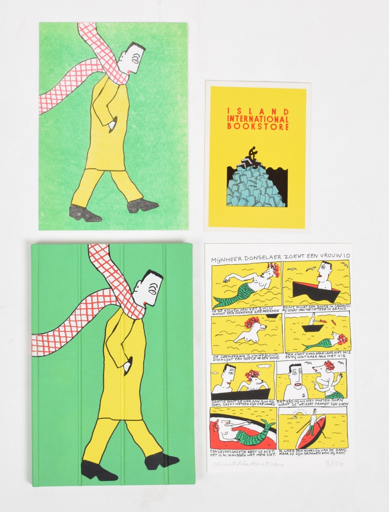Copy of the deluxe bibliophile edition for the fifth anniversary of the Island International Bookstore in Amsterdam, with inlaid invitation and picture postcard of the IIB; (2) Bredero (with contributions by B. Immink, P. Sars and C. van der Pluijm). N.pl., Verzameld Werk, 1991, produced in 25 numbered copies by Alfred Boland (KNUST) as a birthday present for Han Rouwenhorst, (12) screenprinted p., original cardboard, 23.5 x 16 cm.
