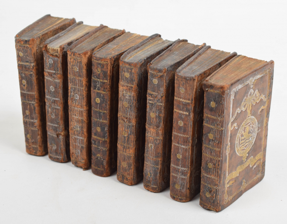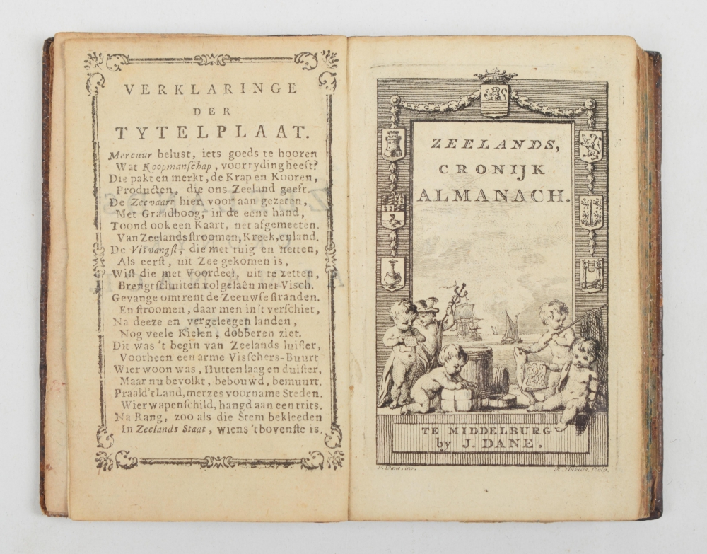 Zeelands chronyk-almanach, voor den Jaare 1777. Bevattende eene beschryvinge der Provincie Zeeland, van deszelfs Opkomst tot op deezen tegenwoordigen Tyd. Ten dienste der Jeugd, gesteld in vragen en antwoorden, voorzien met alle het noodige, behoorende tot een Almanach. Als mede veele Byzonderheden, betrekking hebbende tot de Provincie Zeeland. Middelburg, Jan Dane, 1777. In gilt decorative leather binding, arms of the province of Zeeland. Title engraving, handcoloured folding map of Zeeland "gelyk dat was in't Jaer 1274", folding map Zeeland 1776, (60),viii, 99,(26) pp. 6.5 × 9.5 cm.* + the cronyken for 1779, 1782, 1783, 1787-1790.