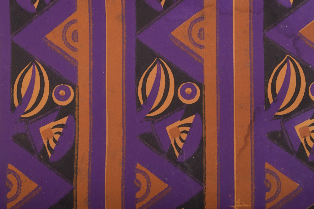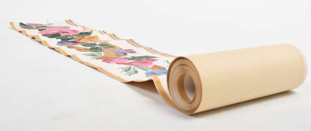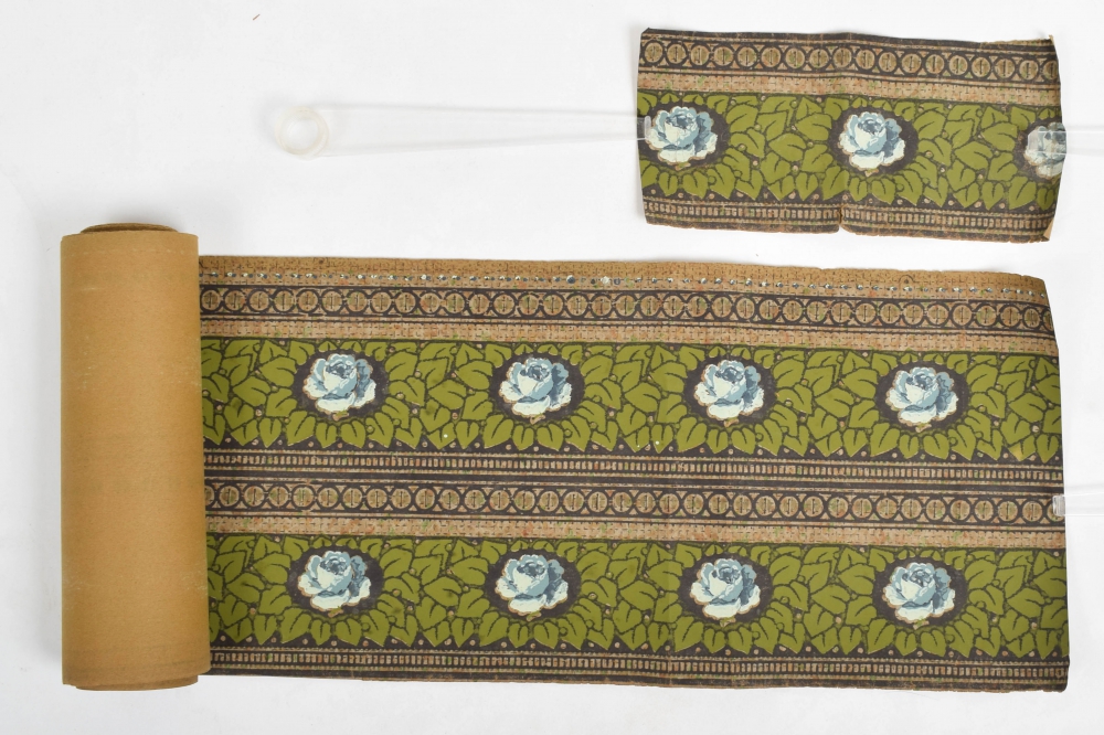 7 strips of wallpaper borders with 5 different motifs, in Jugendstil, ca. 1900-1910. Length twice 6 metre, twice 7 metre, twice 5 metre (identical pattern) and once 4 metre. And several loose pieces.
