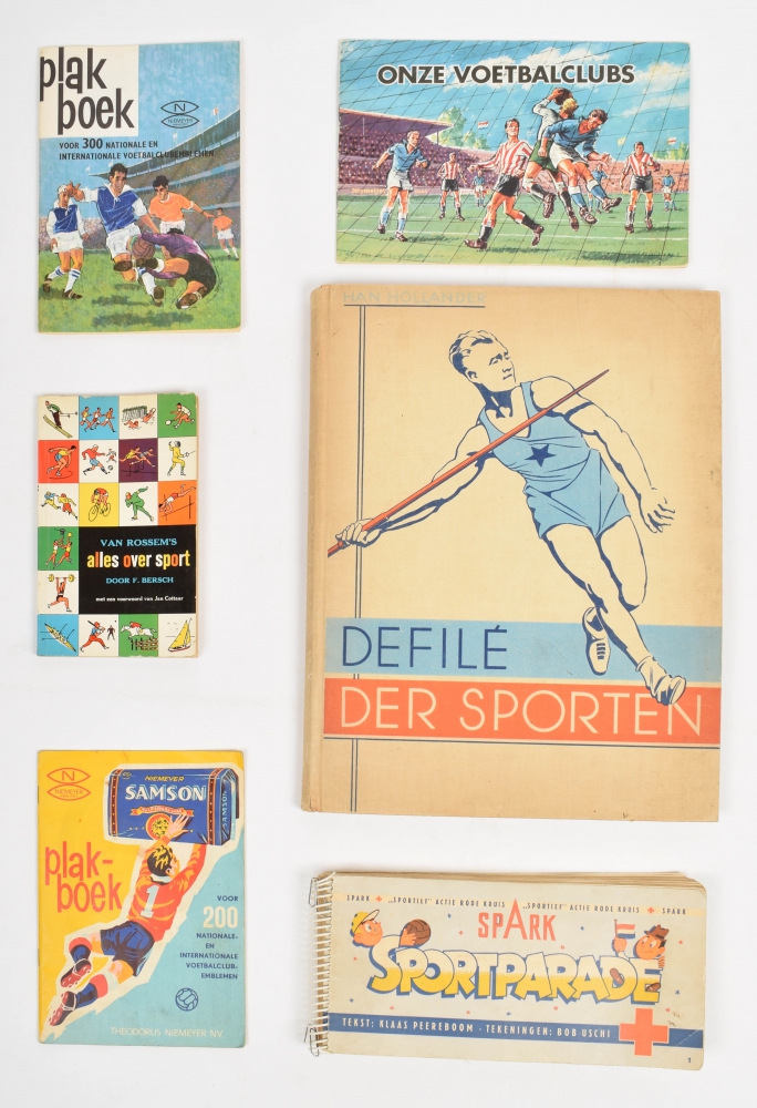 Han Hollander. N.V. Handel-Maatschappij Deli-Atjeh Amsterdam, 1937. Bound, 110 pp. Complete with 190 picture cards + Spark Sportief Actie Rode Kruis - Spark Sportparade. Klaas Peereboom, drawings Bob Uschi, 1950. 114 pp. Complete with 150 picture cards. Oblong, ringbound + Van Rossem's Alles over sport. Door F. Bersch. Complete with all pictures.