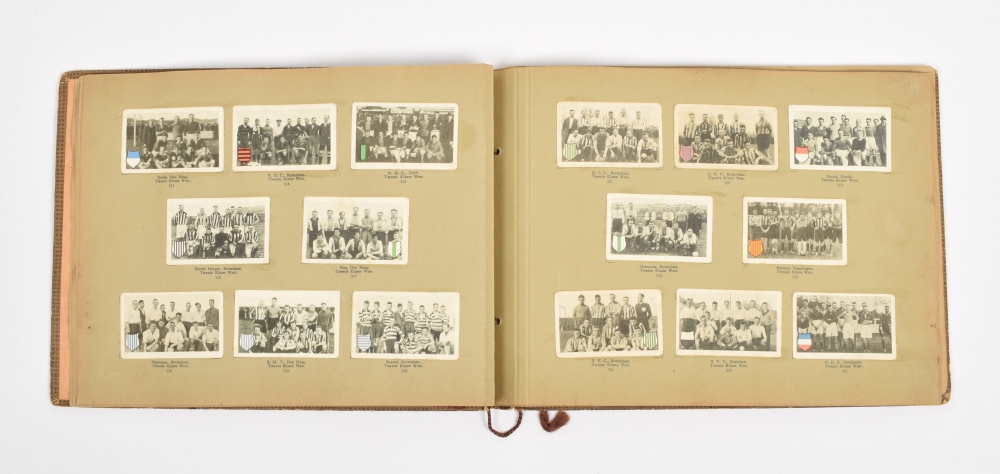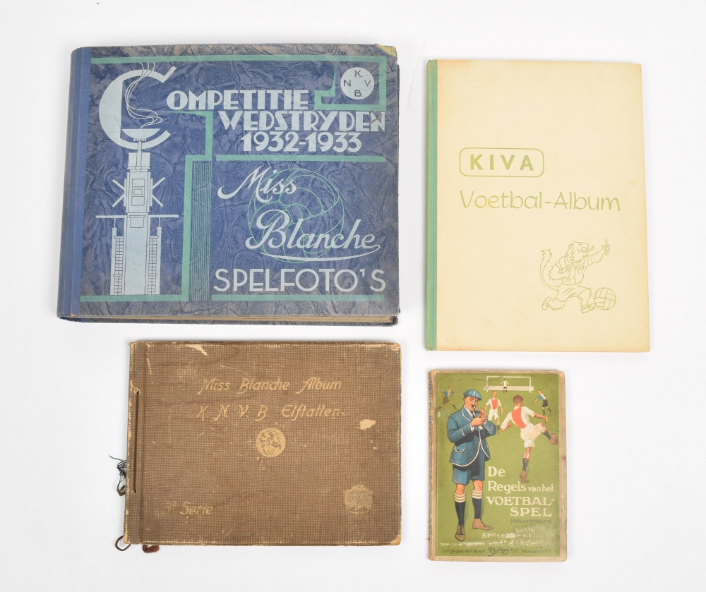 Large oblong album, half cloth, complete with 100 large plates and 100 result picture cards. Neat copy + Philips, Maastricht - De Regels van het Voetbalspel voor Spelers & Kijkers. Bewerkt en toegelicht door C.J. Groothoff, 1924. 58 pp. Complete with 52 picture cards. Front board with some rubbing, page with rule changes 1925 pasted on endpaper + Miss Blanche Album K.N.V.B. Elftallen, 3e serie. Complete, first pages with division added in pen + Kiva Voetbal-Album. Large plates 2, 4 and 10 added in copy, else complete and in good condition (total 4).