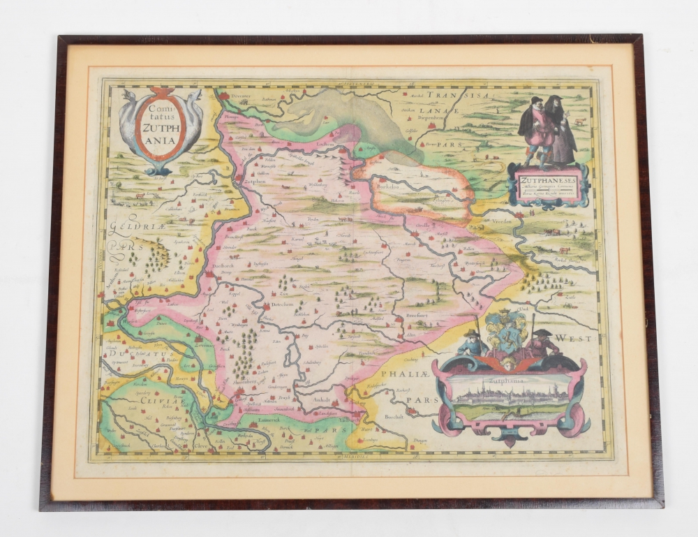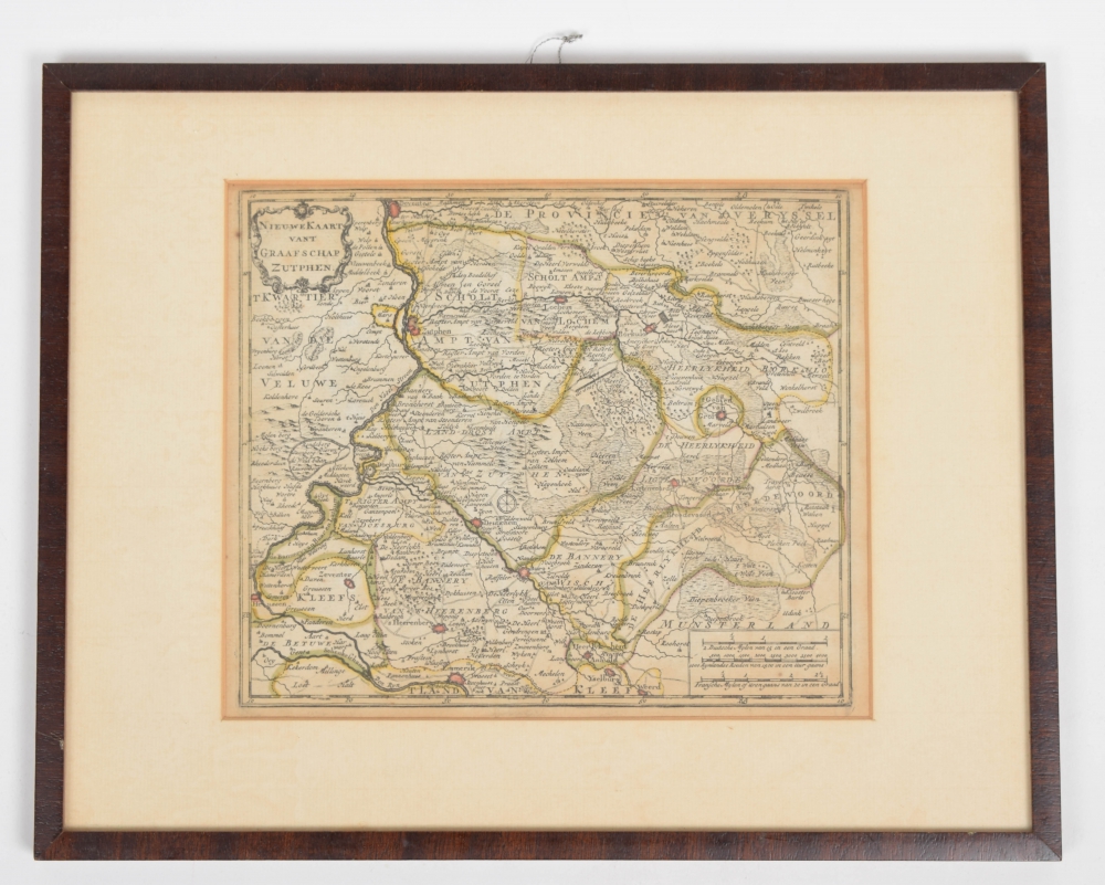 Comitatus Zutphania. Petrus Kaerius excudit 1617. Amsterdam 1617 or 1621. Detailed regional map with mile indicator and inset of the view of Zutphen in beautifully detailed cartouche with above the county coat of arms. Antiquely coloured. Framed under glass in mount (map image 38 x 49 cm.; frame 46 x 57 cm.). Plain frame, tender on reverse, else good. Added: Nieuwe kaart van 't Graafschap Zutphen. Hendrik De Leth. Amsterdam. 1740. Coloured outlines, framed under glass in mount; map image 18 x 22 cm.