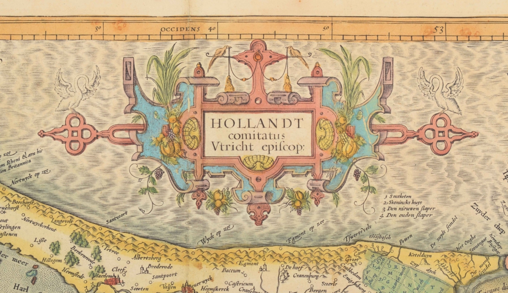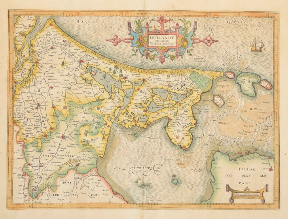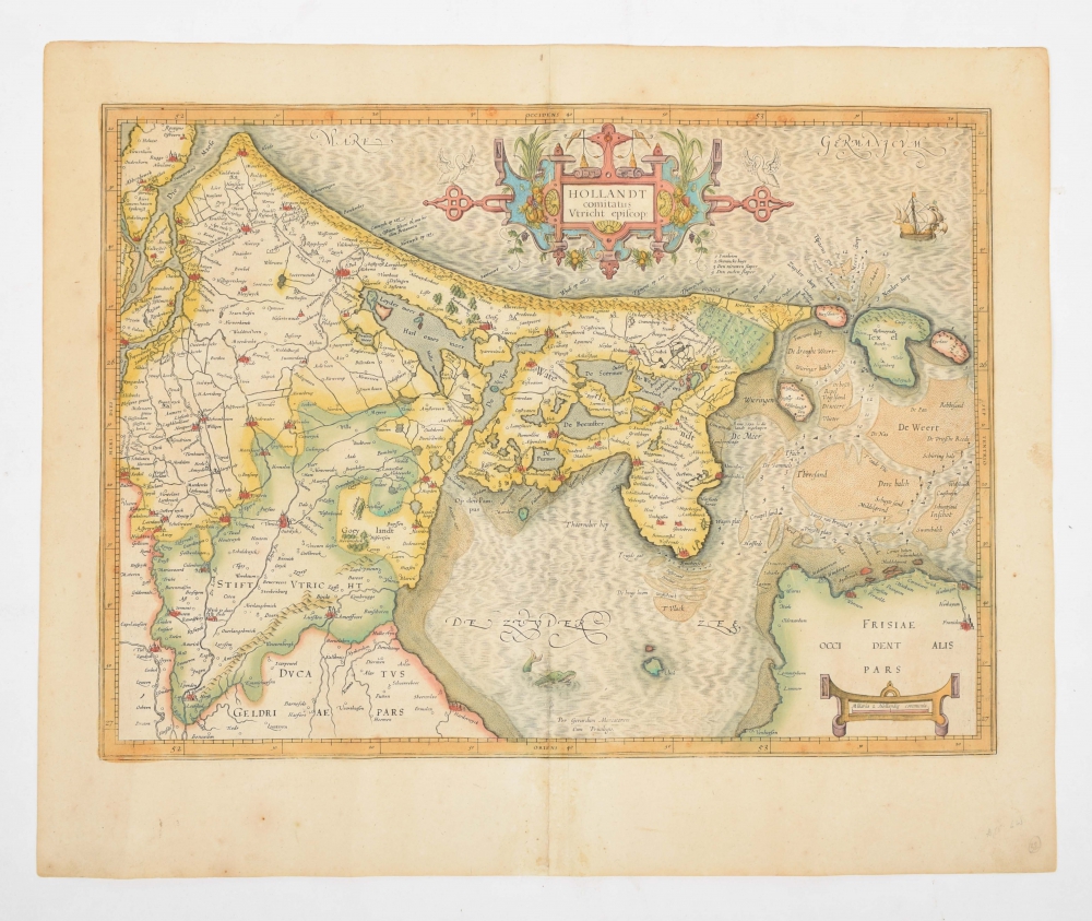 Hollandt Comitatus. Utrecht Episcop. per Gerardum Mercatorem. Antiquely coloured copperplate of Graafschap Holland and Bisdom Utrecht. Leaf 194-95 from the atlas: Gerardi Mercatoris. Atlas sive Cosmographicae Meditationes de Fabrica Mundi. Jodocus Hondius Jr. Amsterdam. 1613-19. Map image 35 x 47 cm. Diagonal fold on right, else very good.