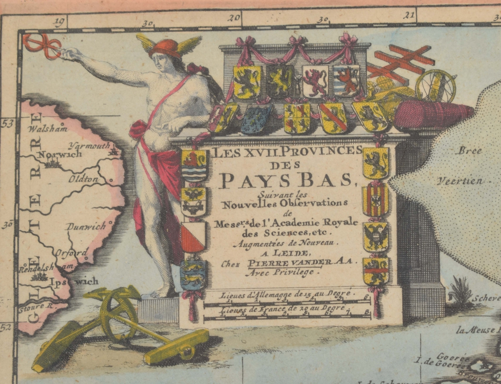 Les XVII Provinces des Pays Bas suivant les Nouvelles Observations. Leiden. Pierre van der Aa. 1713. Framed under glass. Antiquely coloured, map image 26 x 38 cm., frame 29 x 41 cm. Cartouche with title and the 17 provincial arms. Good copy.