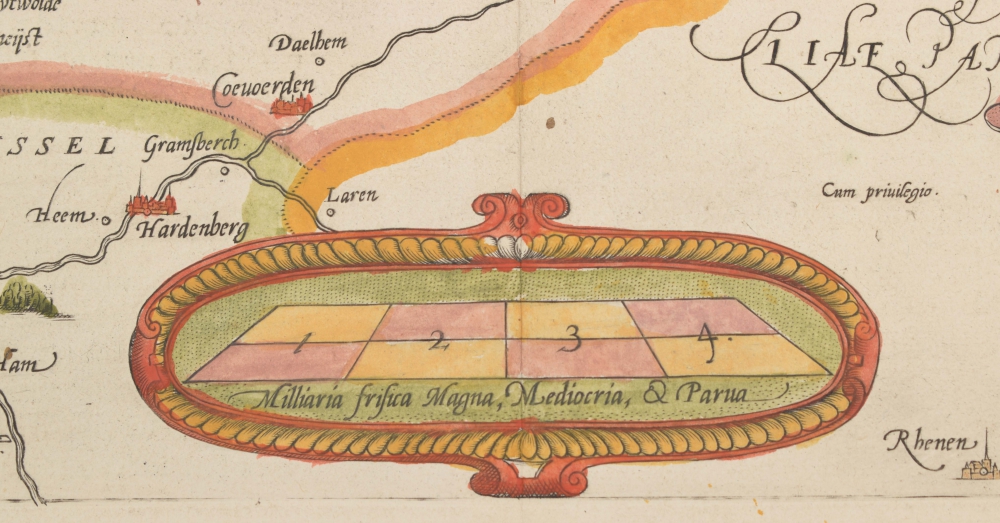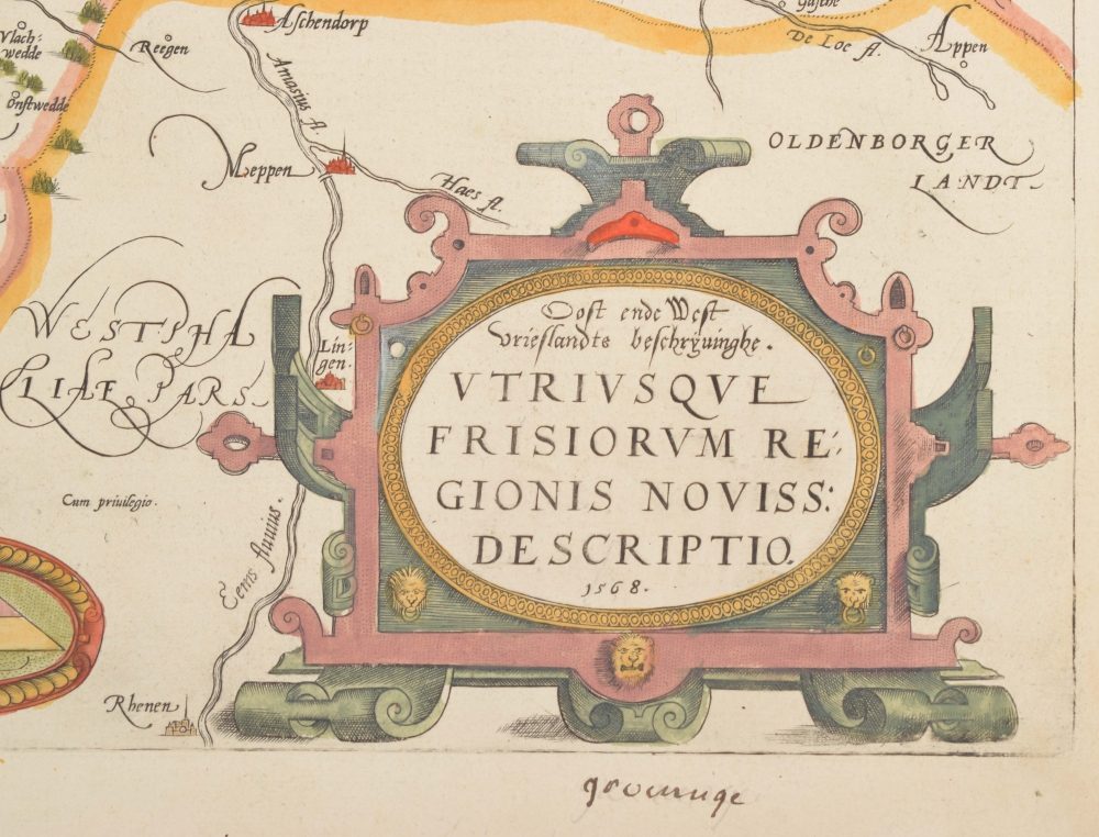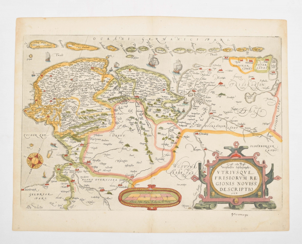 Oost ende West Vrieslandts beschrijvinghe. Utriusque Frisiorum Regionis noviss: Descriptio. 1568. Le Pays de Frise. Coloured copperplate from: Théâtre de l'Univers. Abraham Ortelius. Antwerp. Christoffel Plantijn. 1587. Leaf 41; later colouring. Map image 34 x 51 cm.; faint printing, leaf reinforced along bottom. Groningue in ink on leaf outside map image.