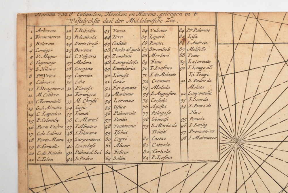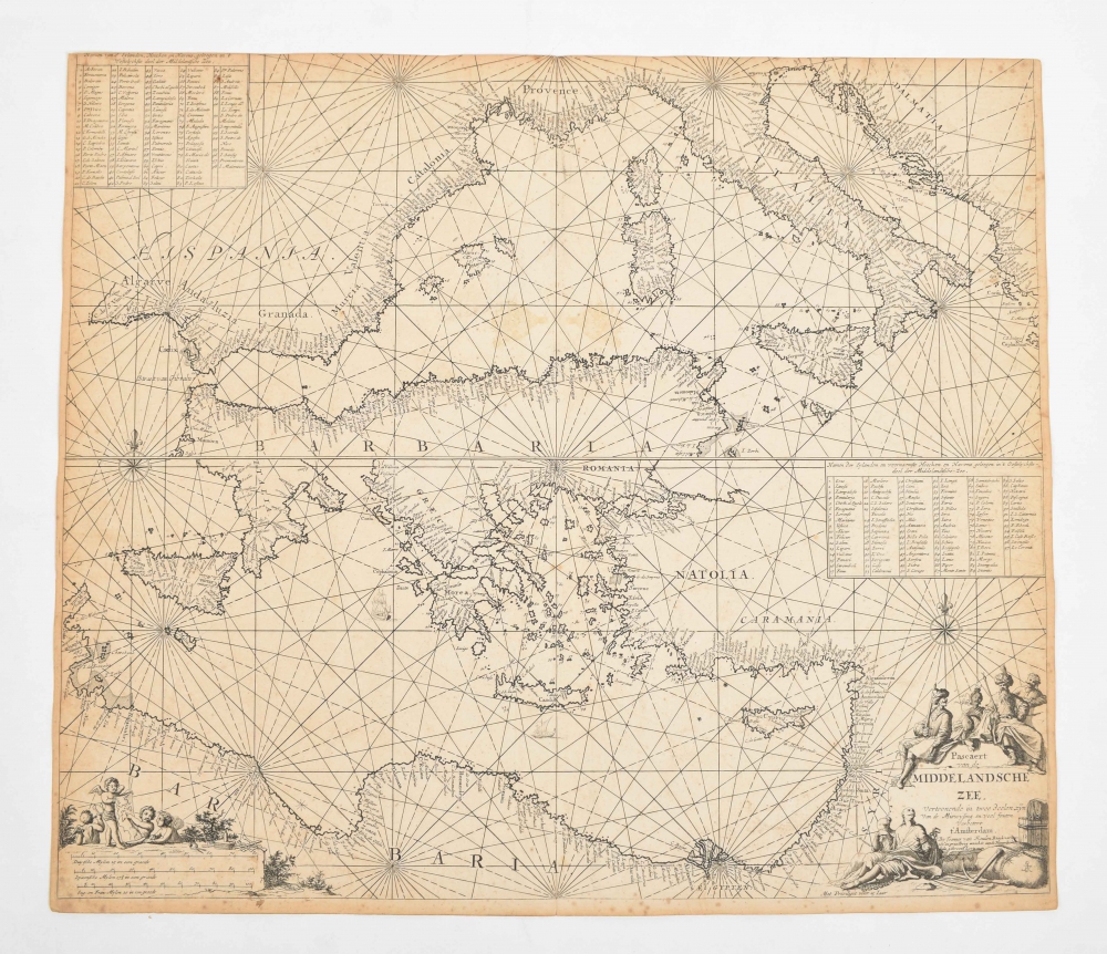 Pascaert van de Middelandsche Zee, vertoonende in twee deelen, zijn van de miswysing en veel fouten verbetert t'Amsterdam. Joannes van Keulen. Ca. 1680-1700. Map image 52 x 60 cm., 2 parts on one leaf (western and eastern Mediterranean). 2 allegorical cartouches at bottom and numbered names of islands, corners and ports with the two individual parts; leaf browned, various small stains, verso blank; on thick paper. Good copy.