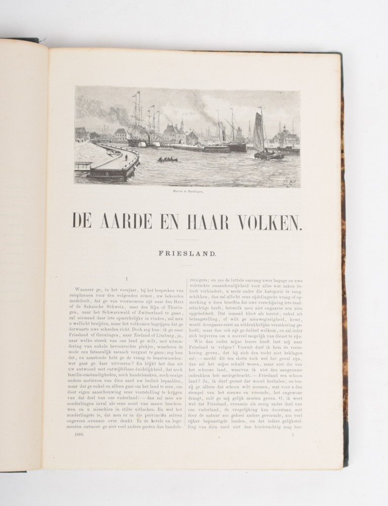 Library stamps (written off) on the title page (incl. of A.L. Heerma van Voss), spine faded and worn; (2) Oud en nieuw Friesland, of Aardrijkskundige beschrijving van die provincie, bijeenverzameld door Jhr. Mr. M. de Haan Hettema. Leeuwarden, H.C. Schetsberg, 1840, VIII,119,(1) p., original printed cardboard (rebacked). Geographical dictionary, organised alphabetically with terms from Aaltjesmeer to Zijlsterbuuren. From p. 109 a treatise on the origin of Frisian place names. With another 5 (rare) other works, incl. the dissertation of S.G.H.A. van Beyma thoe Kingma on Frisian history 1515-1581 (Leiden, 1835, finely bound) (total 7).