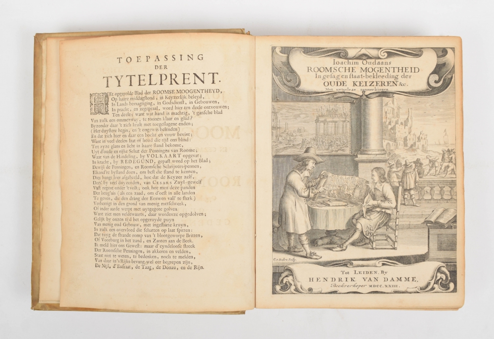 Bevat in een naauwkeurige beschrijving van de magt en Heerschappy der Oude Roomse Keizeren, Vertoonende de Krygs-oefeningen, Oorlogsdaaden en Heldenstukken (...) met meer als dartien hondert Oude Roomse Gedenkpenningen, en meer andere figuren in 't kooper gesneden (...) en verrykt met de geleerde opmerkingen van den Heer en Mr. Pieter Deinoot. Joachim Oudaan. Leiden. Hendrik van Damme. 1723.