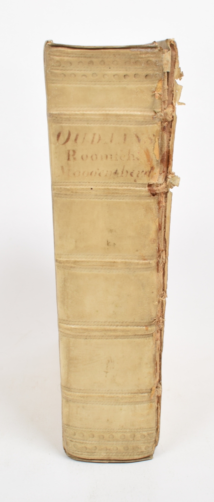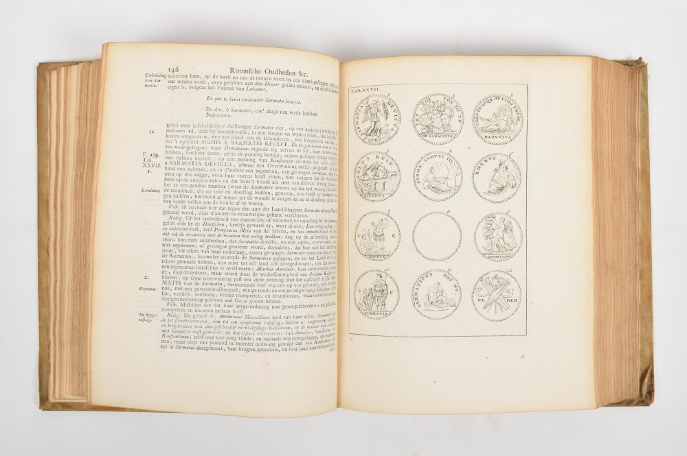 Vellum with blindstamp, 4to, title on spine, illustrated frontispiece with title by C. van Dalen, title with vignette, (24),585 pp. + bladwyzer and complete with 114 tables with coins and another 8 leaves in copperplate (one extra engraving facing p. 23 accompanying the engraving facing p. 30), first and last endpaper with brown stains, stamp on title, spine tender from binding, interior else very good.