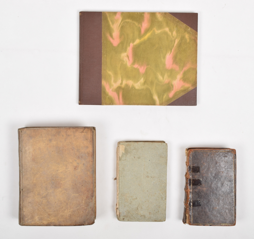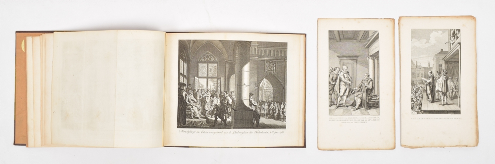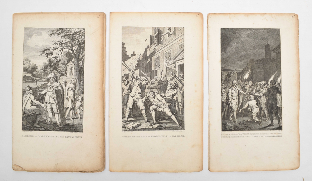 Album, oblong, with 28 historical prints from Wagenaars Vaderlandsche Geschiedenis in half-cloth binding with marbled endpapers; accompanied by another 19 smaller-sized historical prints + De Verwarde Adelaer en Ontstelde Leeuw. Amsterdam. Dirck Pietersz Pers. [1647]. Vellum, small 4to, (18),911,(23) pp. Shabby copy with the complete text, without the plates + Waarachtige Historie van (...) den Heer J. van Olden-Barnevelt. J. Naeranus. Rotterdam. 1670. Shabby copy, lacks portrait of Van Oldenbarnevelt, other prints included + Geographie Elementaire a l'usage des Colleges. Paris. Bastien. 1779. Shabby copy with 7 maps.