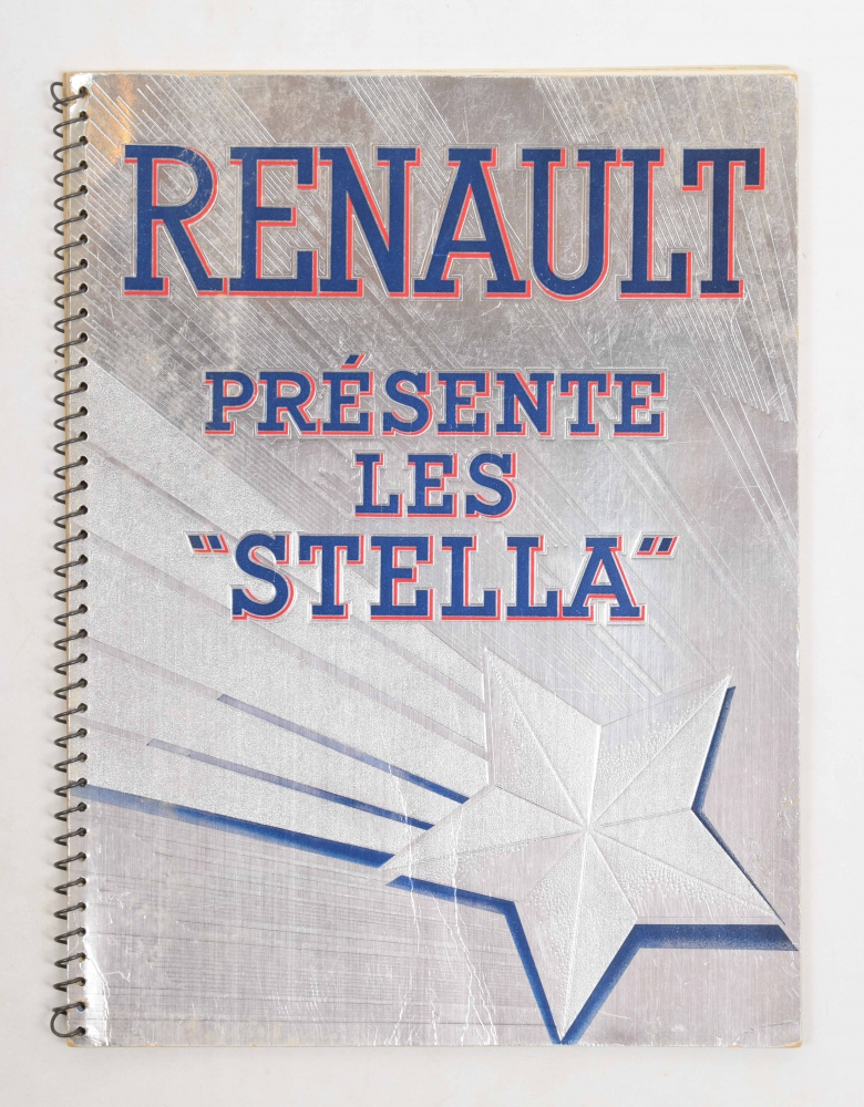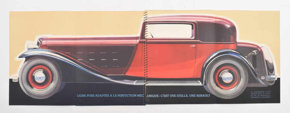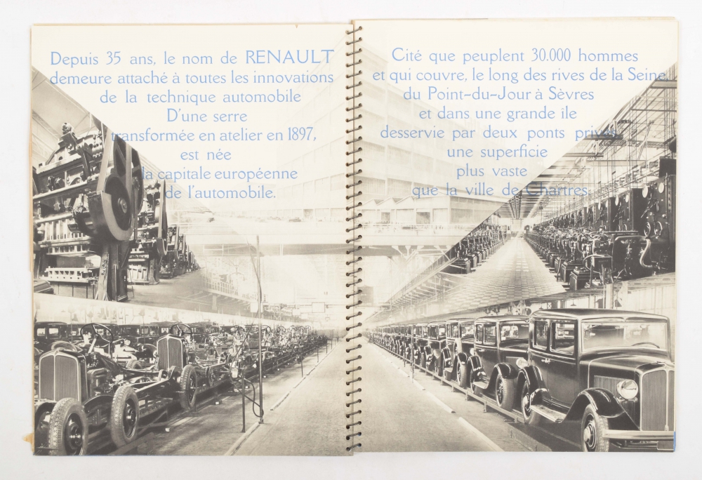 Printed by Draeger for Société des Usines Renault à Billancourt, Seine, n.d. (1932), (17) p. (incl. inside front wrapper) with text printed in blue and richly illustrated with (double-page photomontage) photographic illustrations, also a 4-page colour plate with one large illustration on inside (31.5 x 91.5 cm.) and 4 smaller illustrations on outside, original spiralbound silver-coloured boards printed in relief, folio.