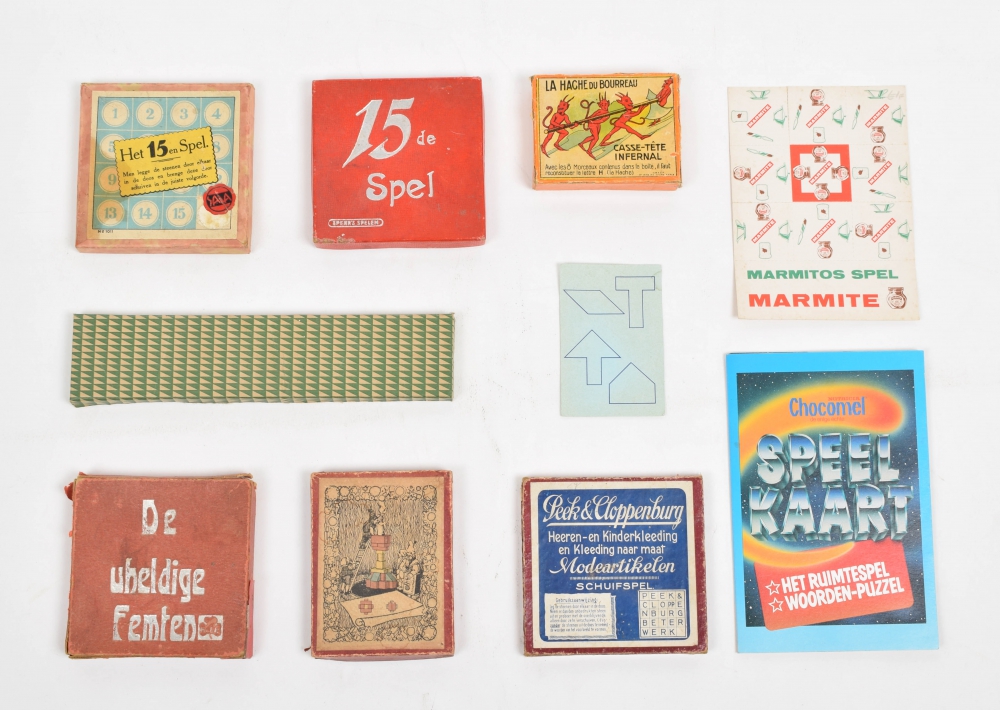 La Hache du Bourreau. Casse-Tête Infernal, Paris, ca. 1910 + Peek & Cloppenburg Schuifspel, ca. 1920 + 15e Spel, Spear's - and another edition of 15e spel + Sickesz schuifspel (with copied insert sheet) + another 3 post-war games - and Anker Steendozen; miniature edition in original box (total 9).